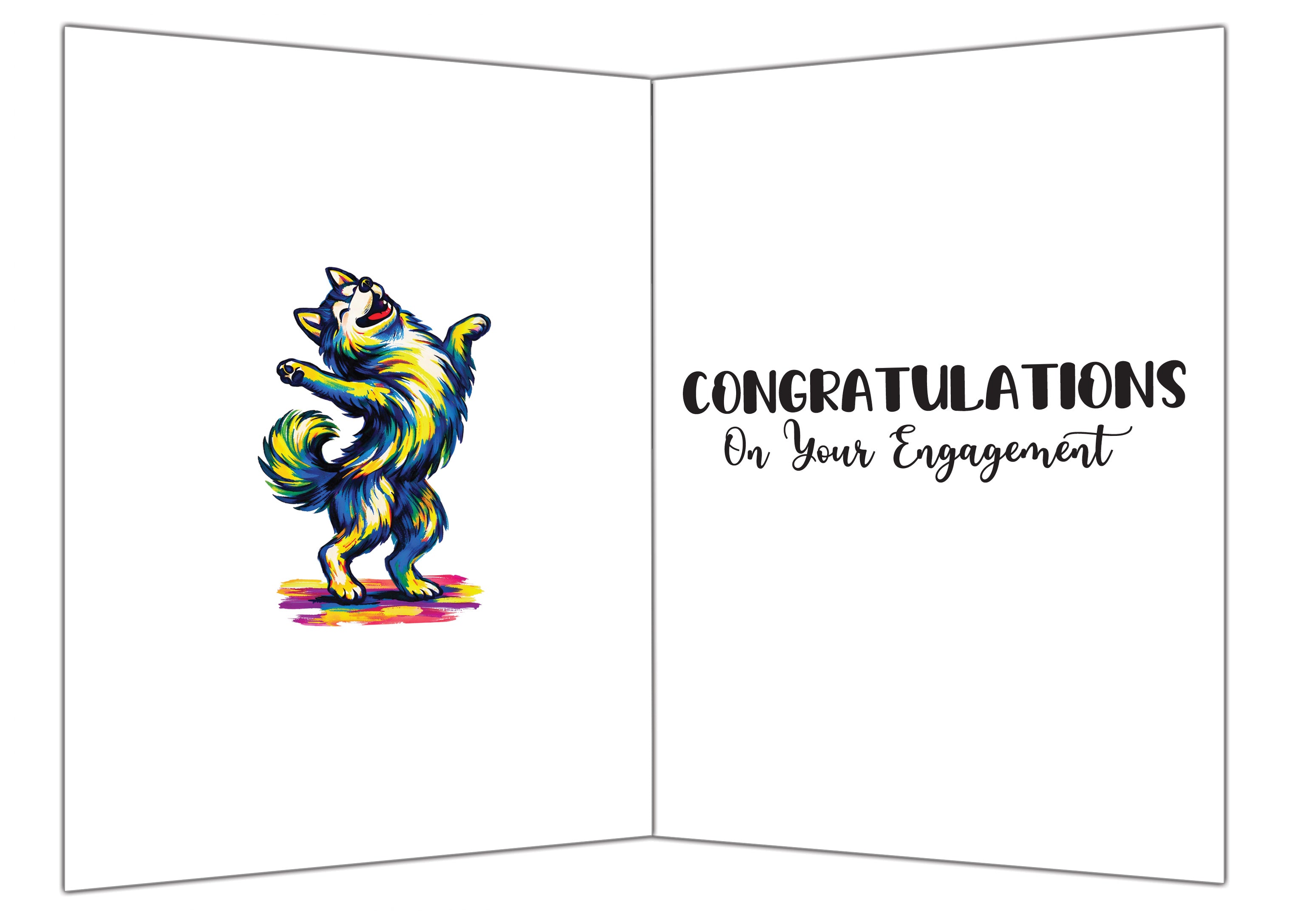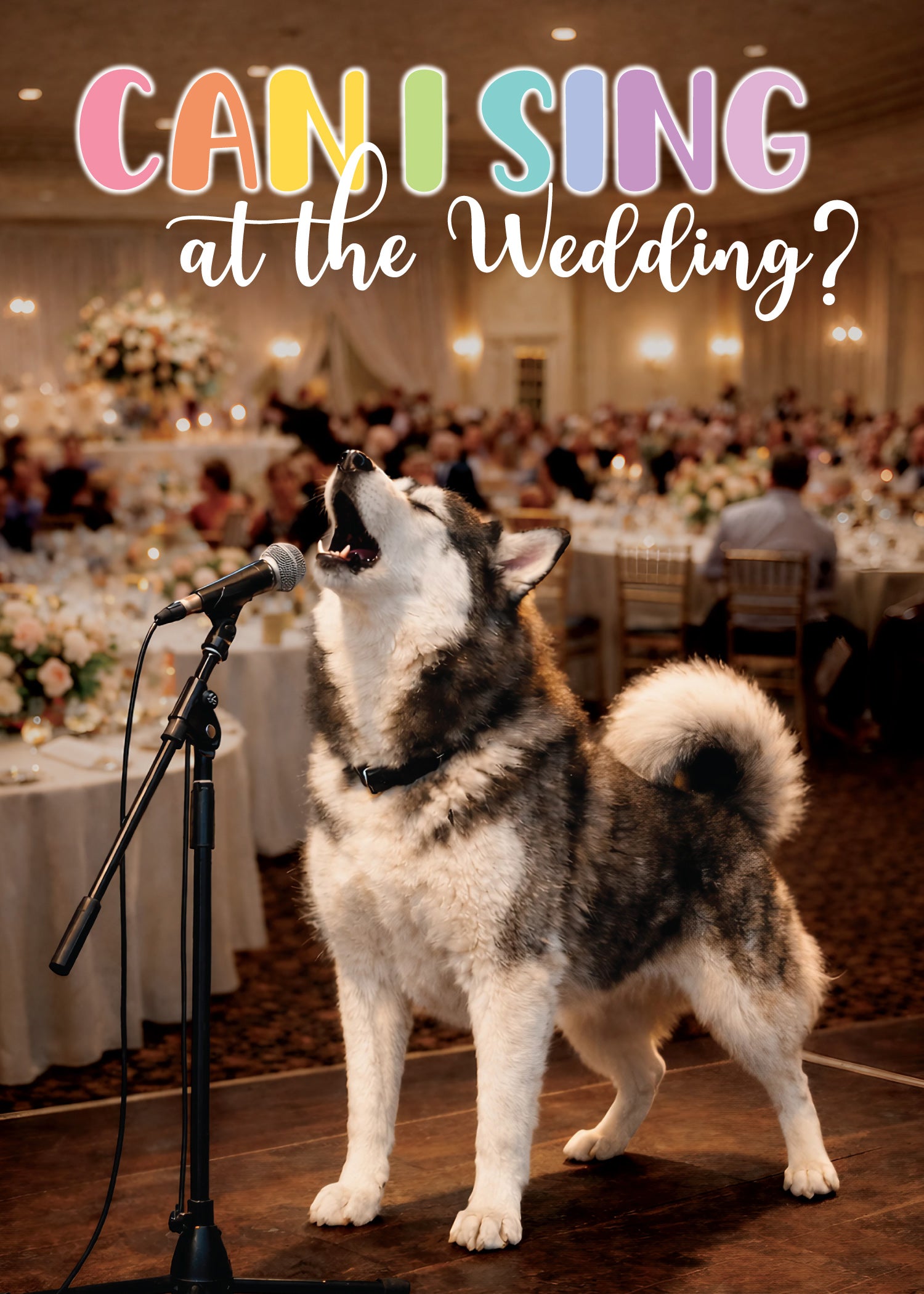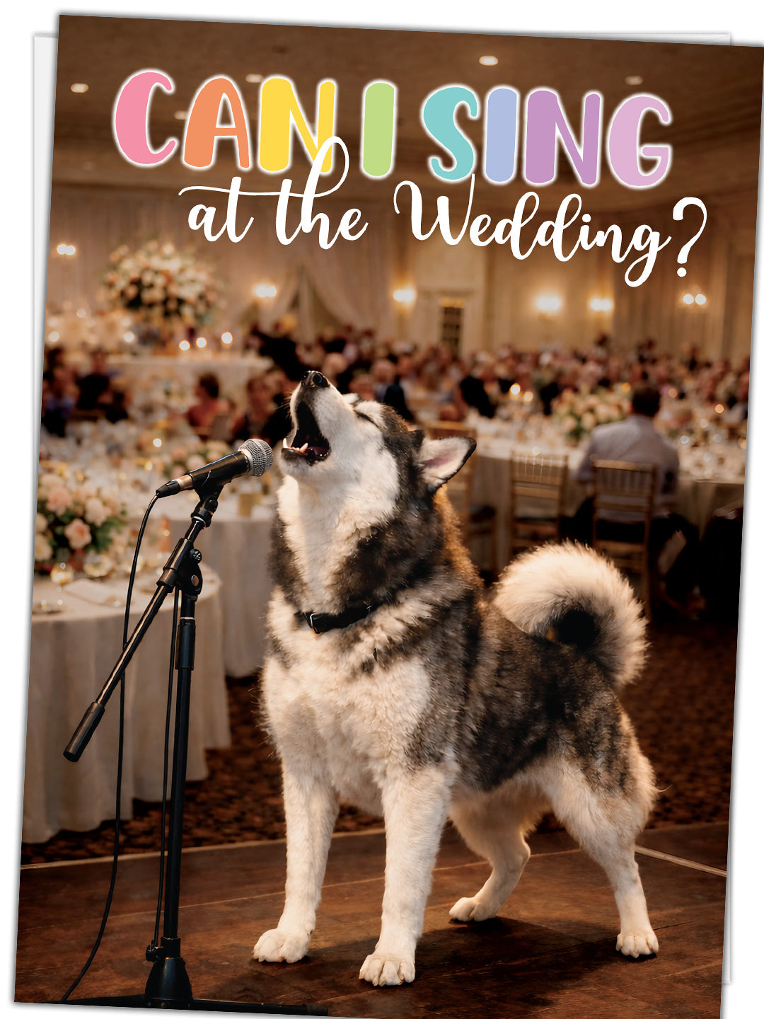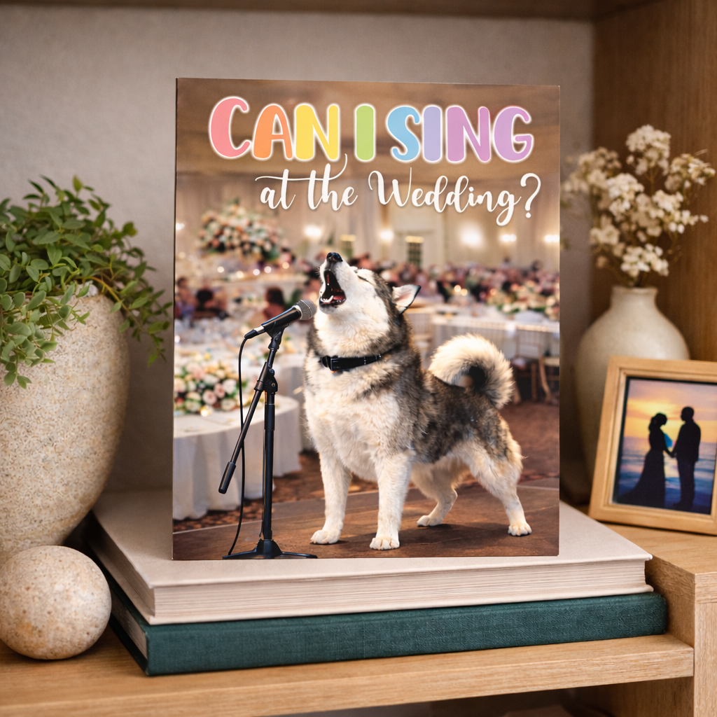 - The front of the card bursts with celebration: a spirited Husky singing into a microphone at a wedding reception, surrounded by the glow of a joyful crowd. It captures the exact feeling of wanting to shout “Congratulations!” from the rooftops when two people find their forever. The colorful “Can I sing at the wedding?” headline adds humor and personality, making this a standout choice for engagements that deserve something fun, modern, and full of life.