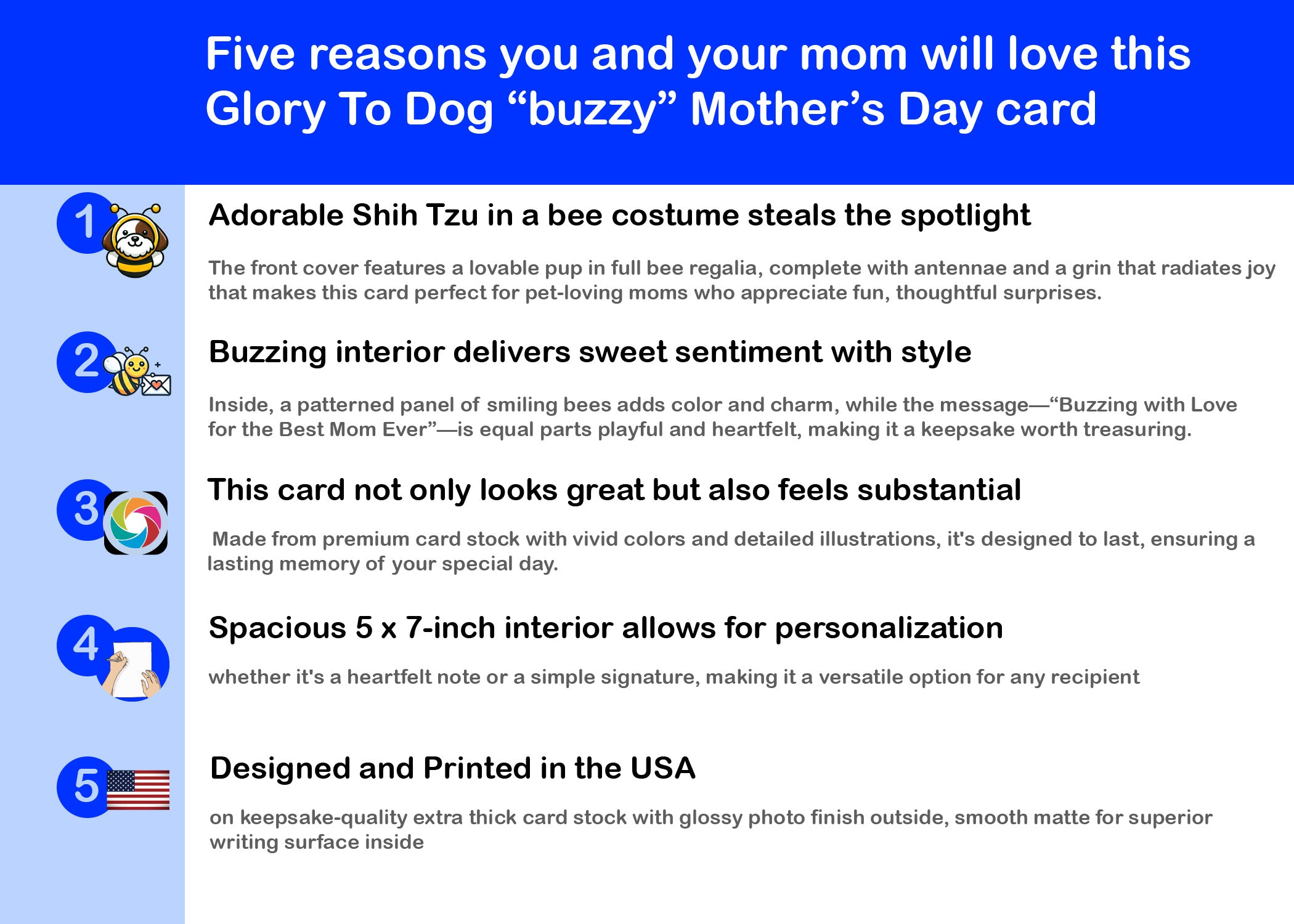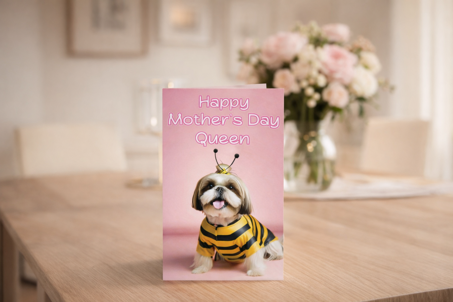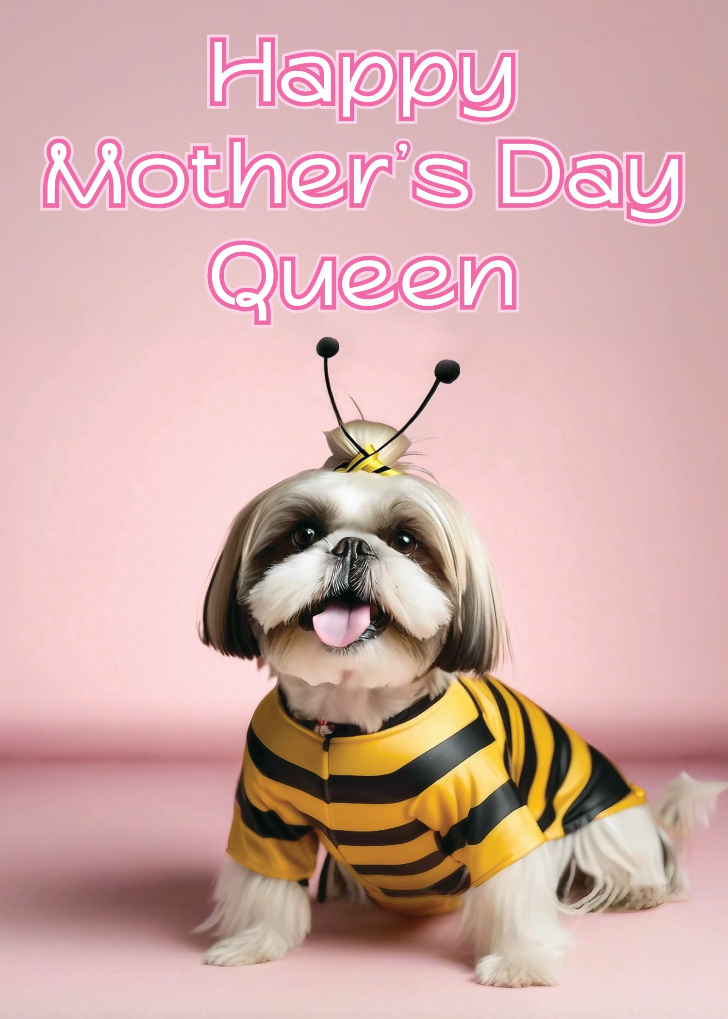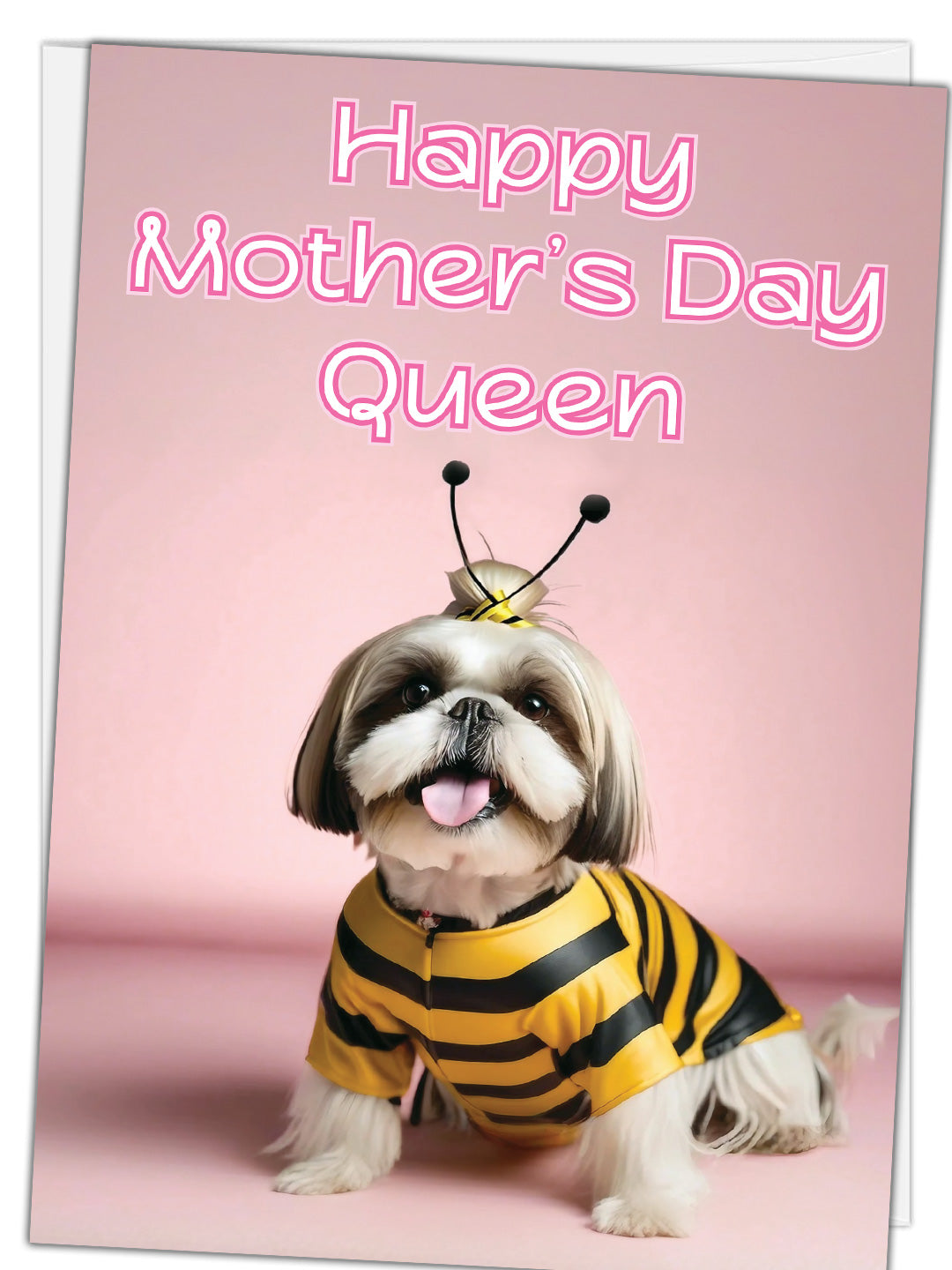 - Delight a dog-loving mom with a card as unique and full of personality as she is. The front features a lovable Shih Tzu in a bee costume, sitting proudly under the words “Happy Mother’s Day Queen.” With soft pink tones and playful royal flair, it’s a fun way to recognize the queen bee in your life.