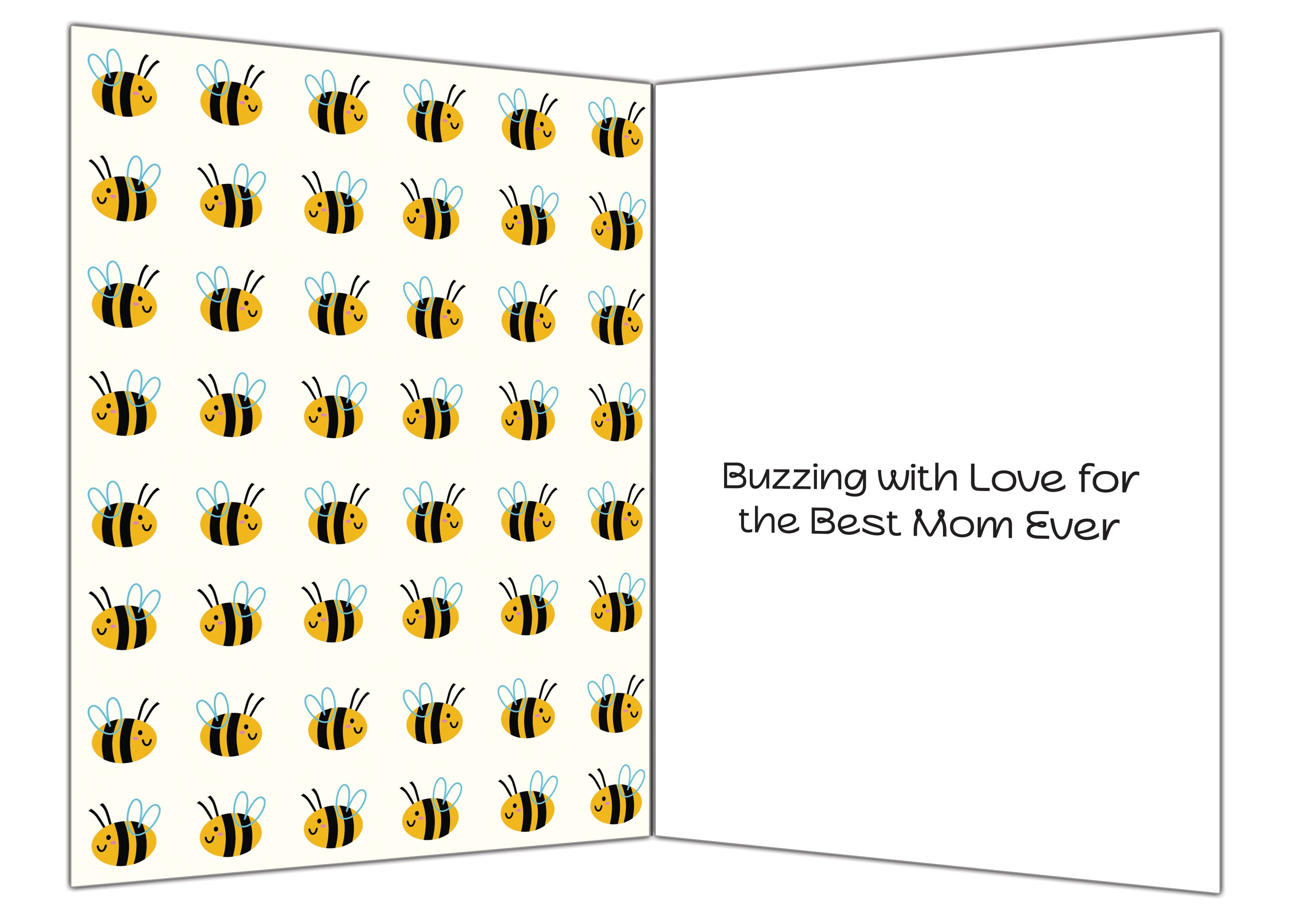 - Open the card to reveal a cheerful pattern of smiling cartoon bees that buzz across the left panel, creating a bright and energetic vibe. The right panel carries the heartfelt message: “Buzzing with Love for the Best Mom Ever.” It’s a perfect way to show appreciation with a touch of humor and sweetness.