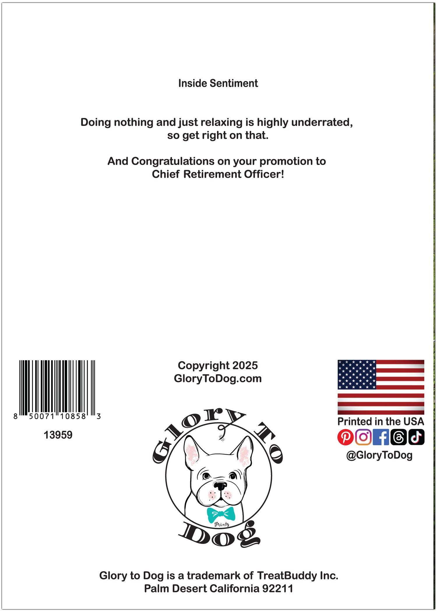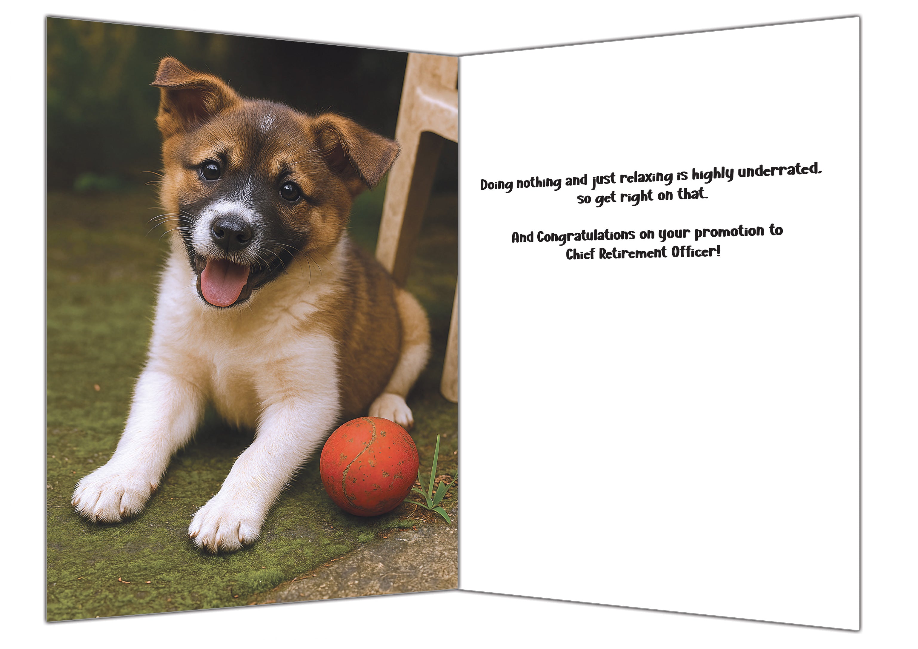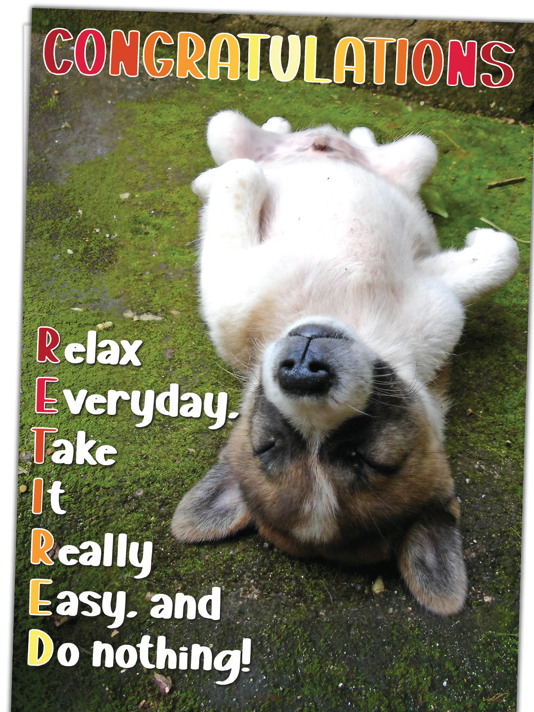 Celebrate retirement with a card that perfectly captures the joy of finally slowing down. The cover features an irresistibly relaxed pup stretched out without a care in the world—an instant mood-setter for anyone dreaming of easy mornings and stress-free days. The playful acrostic message spells out R-E-T-I-R-E-D with a wink, encouraging the new retiree to “Relax Everyday, Take It Really Easy, and Do Nothing!” Inside, the cheerful puppy reappears, happily lounging with a well-loved ball, delivering a warm reminder that doing nothing is a deeply underrated skill. The interior message gently nudges them to embrace their new role as “Chief Retirement Officer,” with a vibe that’s encouraging, humorous, and genuinely heartfelt. Whether you’re celebrating a coworker, friend, or family member, this card blends sweetness and humor into a memorable keepsake that honors the milestone while lifting spirits and sparking a smile.