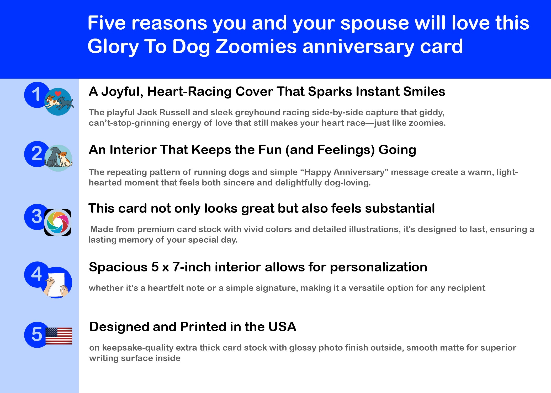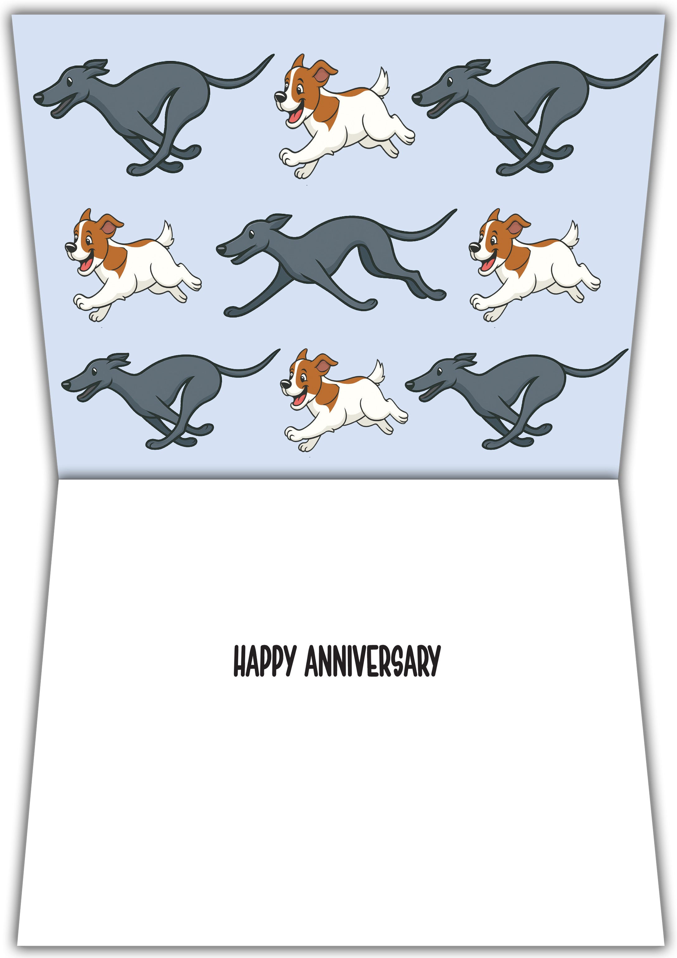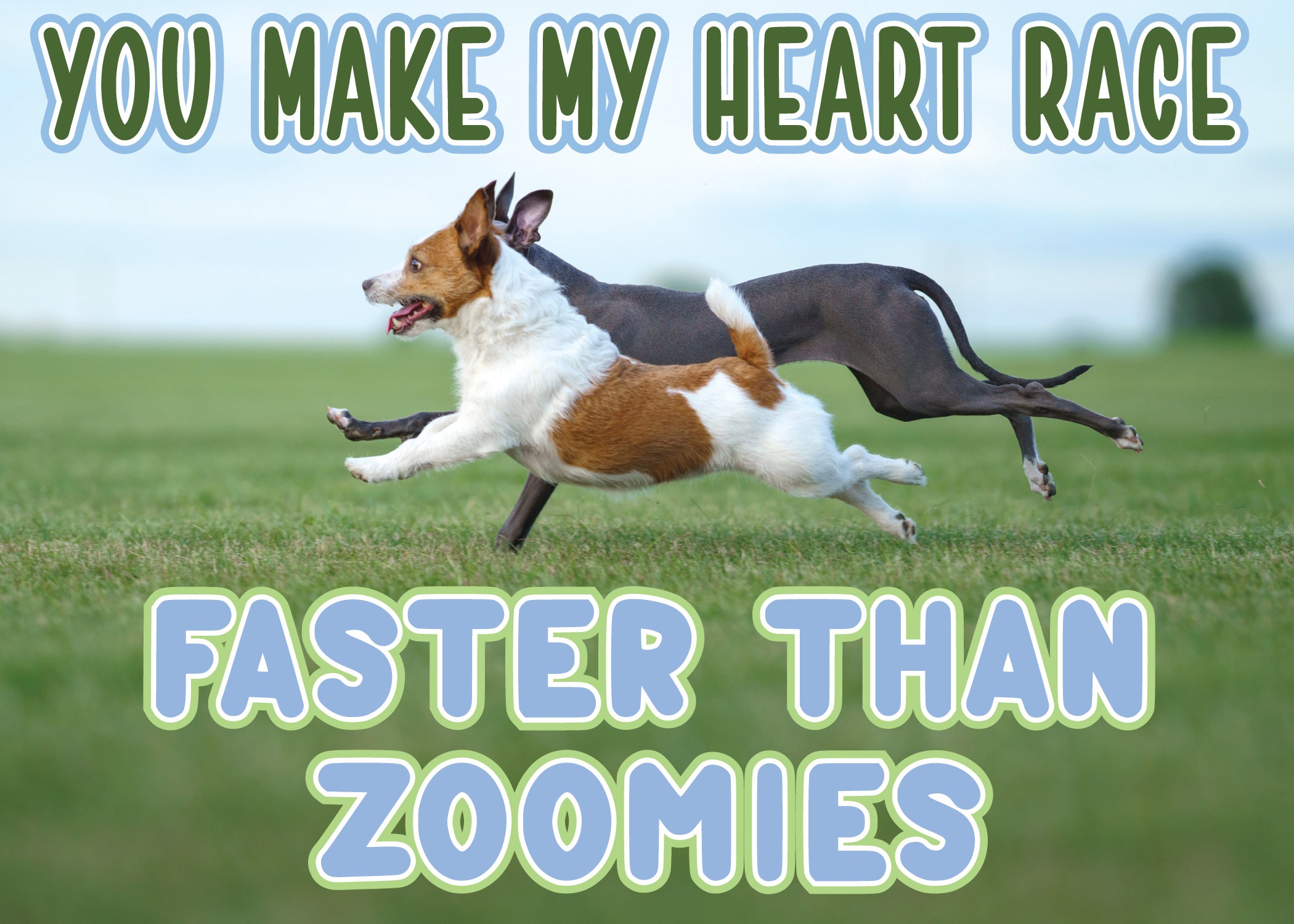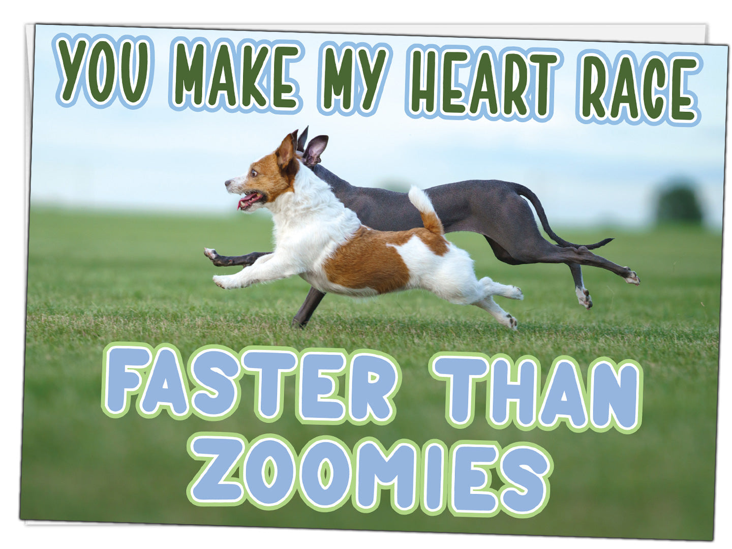 Celebrate love at full speed with this playful Glory To Dog anniversary card featuring two happy pups racing across a grassy field. The photo captures a joyful Jack Russell and sleek greyhound mid-zoomie—an energetic symbol of excitement, connection, and the thrill of being together. The caption, “You make my heart race faster than zoomies,” pairs humor with heartfelt emotion, perfectly balancing laughter and affection. Inside, a charming pattern of running dogs and the simple message “Happy Anniversary” carry the theme forward with warmth and sincerity. Whether it’s for your partner, spouse, or another dog-loving couple, this card delivers smiles, love, and wagging-tail energy in equal measure. It’s a fun, lighthearted way to say, “You still make my heart race.”