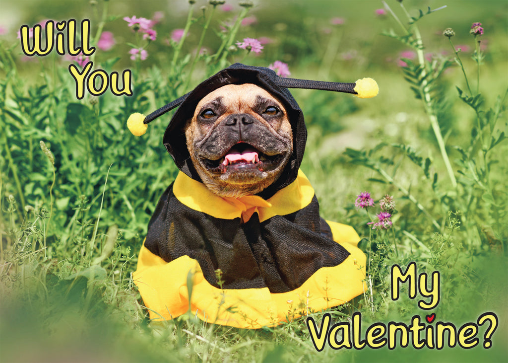 Will You (Bee) My Valentine Greeting Card (Landscape/French Bulldog in bee costume)