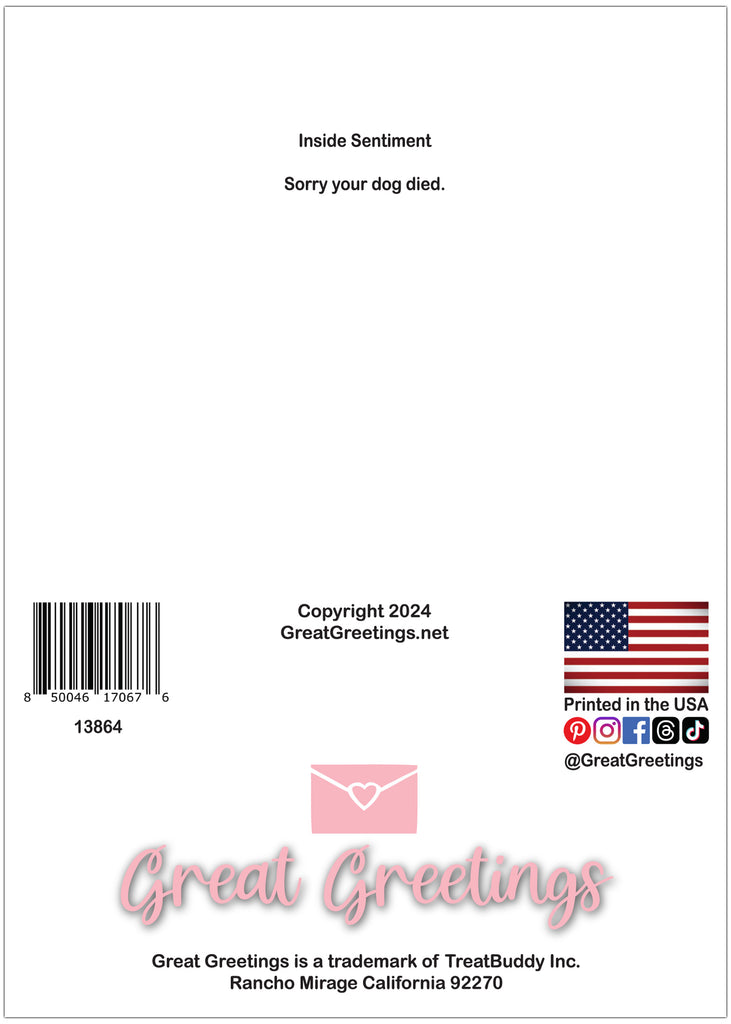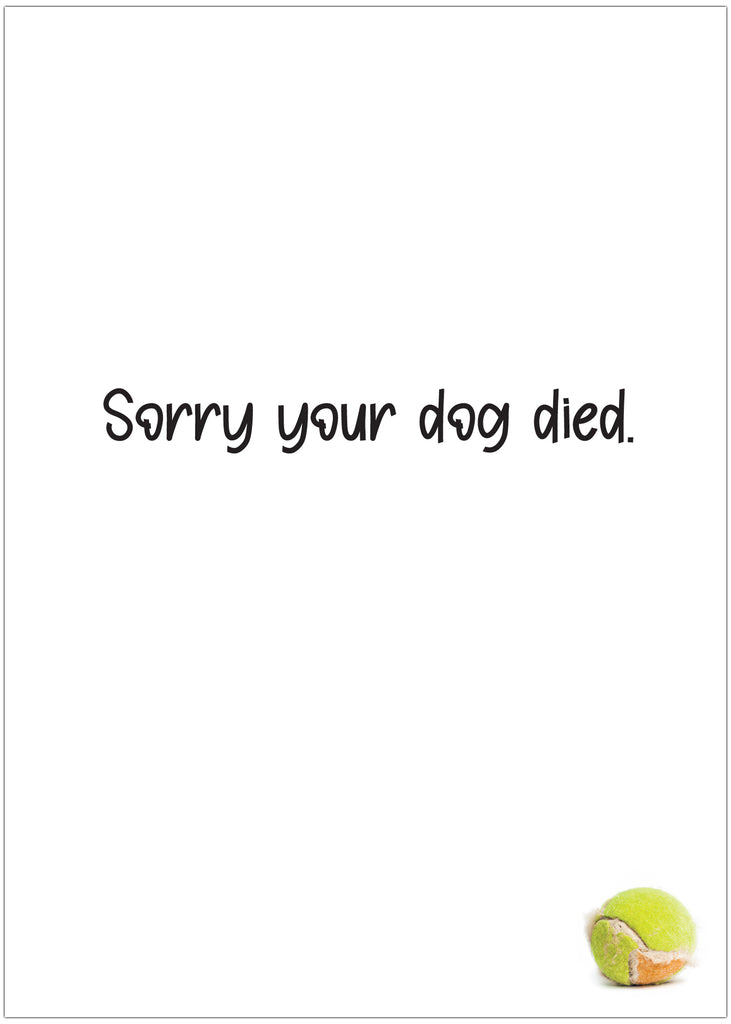 Inside, the sentiment echoes the heartfelt condolences with the words, "Sorry your dog died," complemented by a poignant image of a well-loved tennis ball—a symbol of cherished memories and playful moments shared. This card encapsulates the essence of empathy and support during a time of profound grief. With its understated design and genuine message, it serves as a beacon of comfort for those navigating the somber journey of bidding farewell to a beloved canine companion.