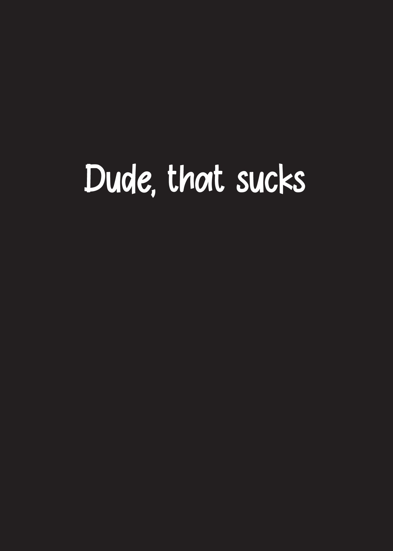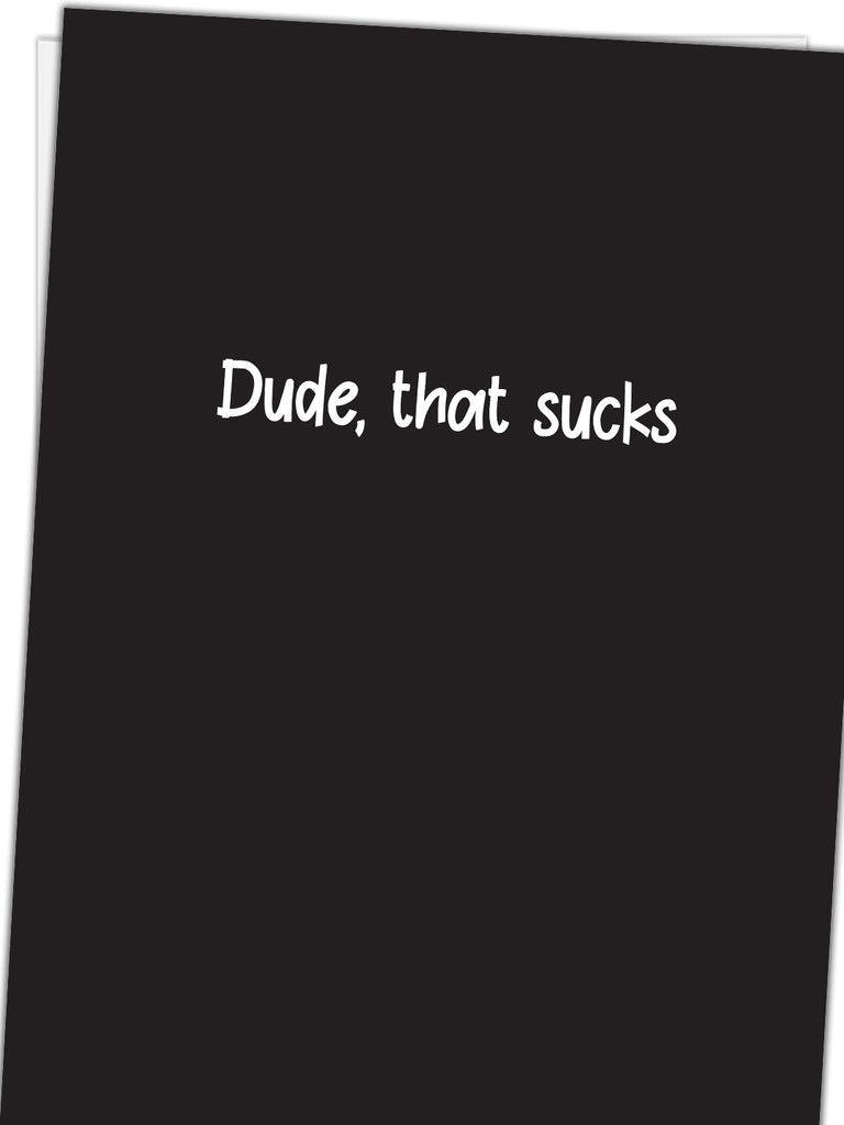 Offering solace in times of sorrow, our bereavement card for a departed dog speaks volumes of empathy and understanding. Crafted with simplicity and sincerity, this card acknowledges the unique bond between man and his faithful companion. The cover, an unassuming black canvas adorned with reverse white type exclaims, "dude, that sucks," resonating with the raw emotions of loss.