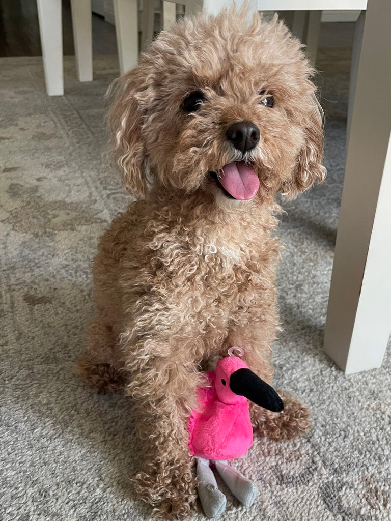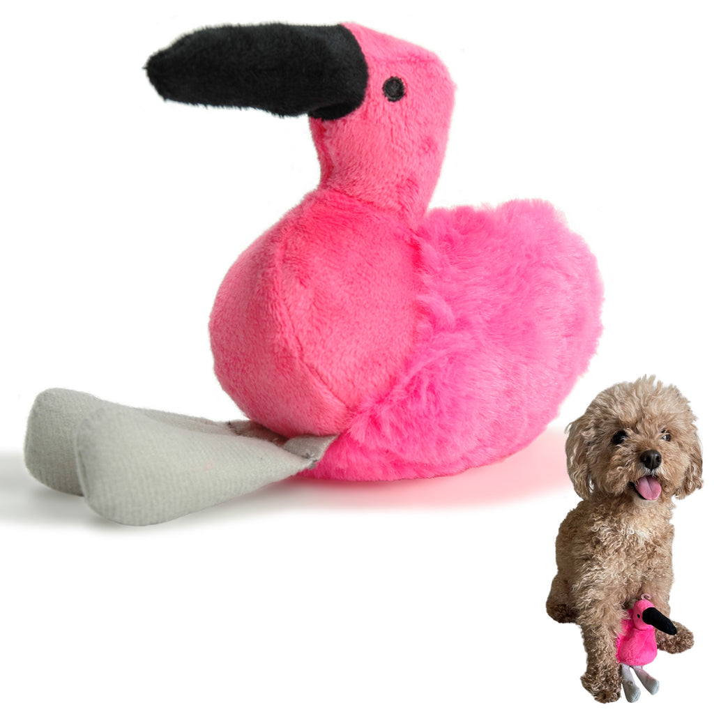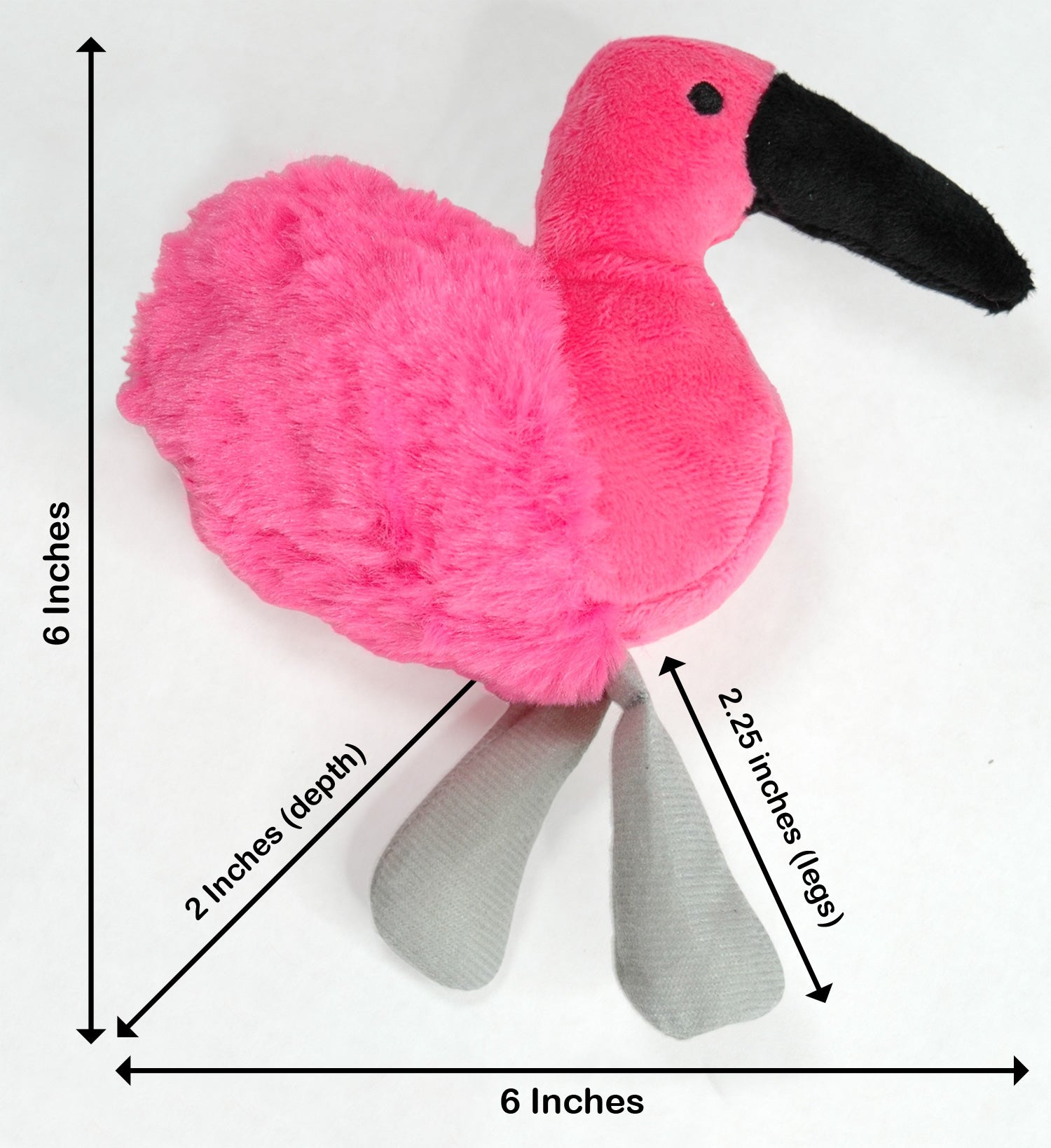 Finally a flamingo toy for small dogs! This soft and bright pink stuffed bird has a long black beak and floppy gray legs perfect for little mouths to fetch, fling and squeak. Made for gentle play and cuddles but built for durability and long lasting fun. The fluorescent pink color and embroidered details make this flamingo the perfect toy and gift for any pup!