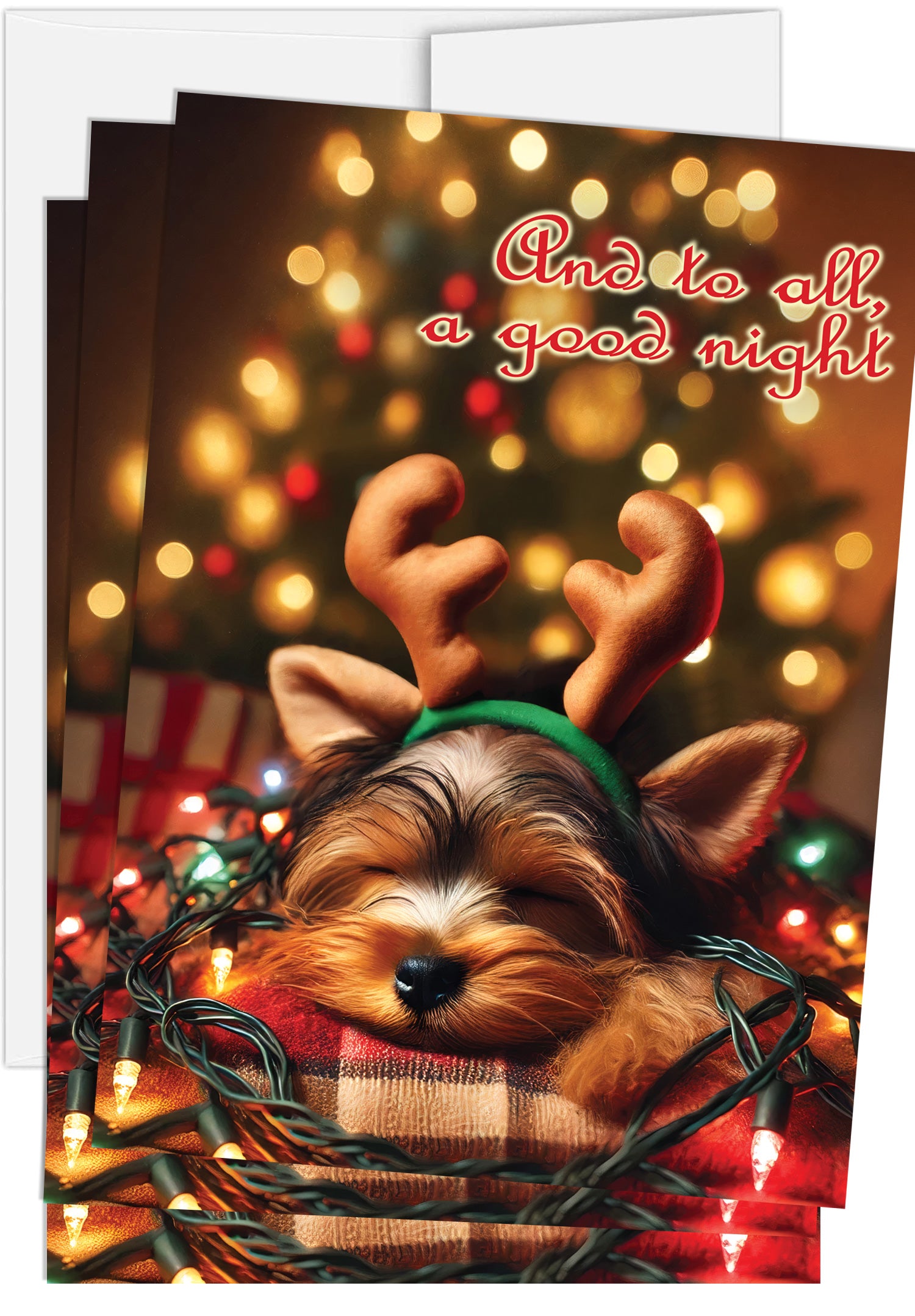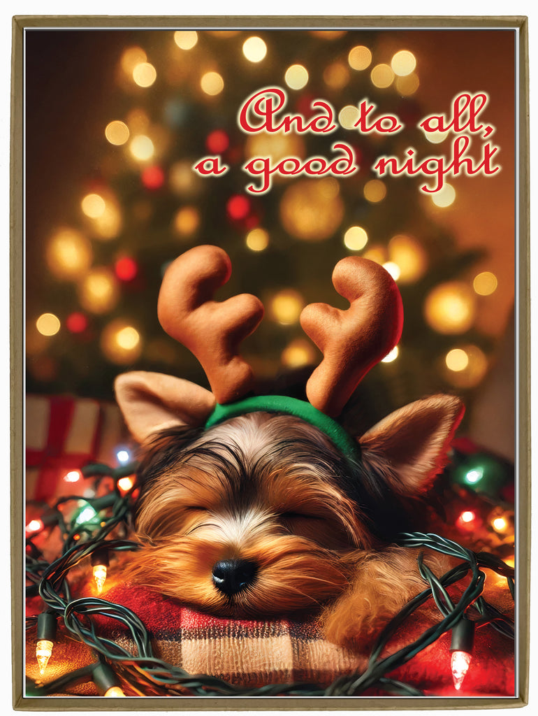- On the front of this festive holiday card, a tiny Yorkshire Terrier snuggles beneath a twinkling Christmas tree, sound asleep in a tangle of lights and cozy holiday magic. With reindeer antlers perched on its head and the gentle message “And to all, a good night,” this image captures the peaceful joy and wonder of the season. It's a heartwarming moment that’s sure to bring a smile to anyone who receives it.