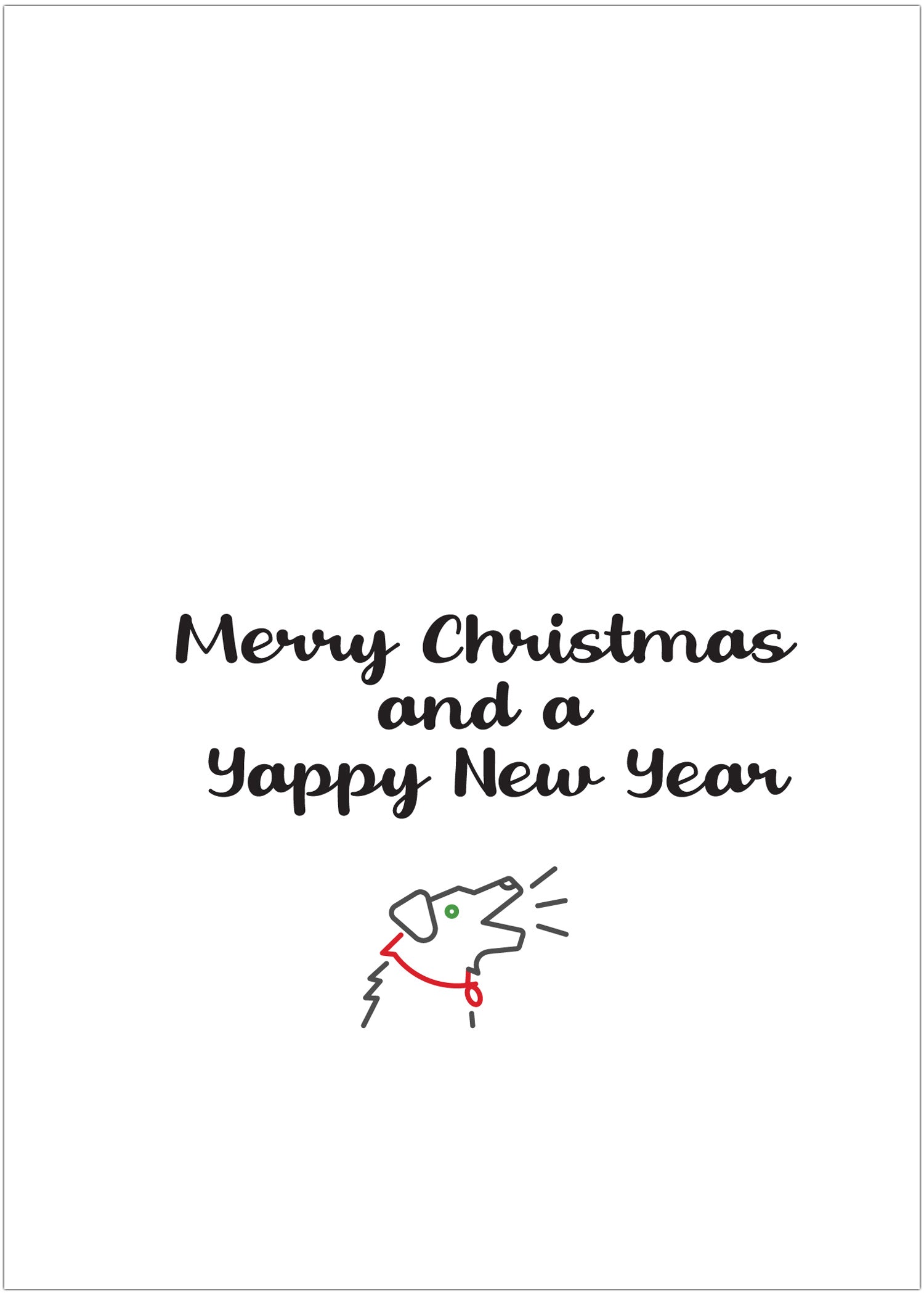 - Inside, the sentiment continues with a playful twist: “Merry Christmas and a Yappy New Year.” This cheerful pun adds a burst of holiday fun for dog lovers and families alike. Whether you’re sending warm wishes to a friend, coworker, or your favorite pet parent, this card offers the perfect blend of sincere spirit and playful charm. Great for anyone who believes Christmas is best celebrated with a tail-wag and a joyful woof.
