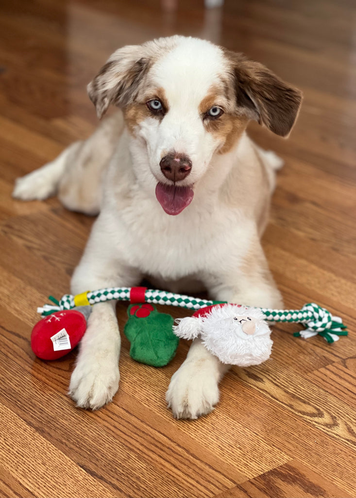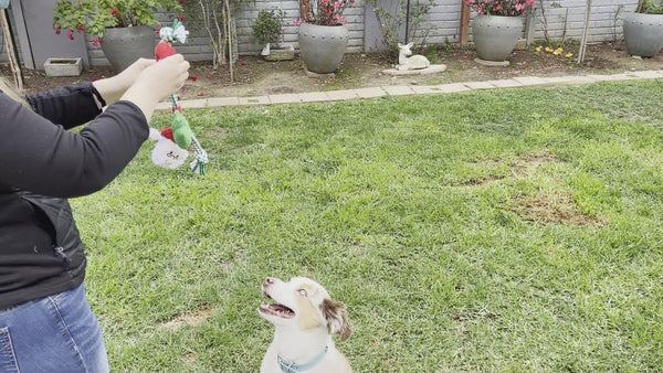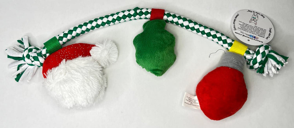 Everyone contributes to the family Christmas tree, and now your dog can play with his own strand of ornaments made out of soft plush with a squeaker in each, safely. The Christmas plushie has a bright red Christmas tree light bulb, a leaf of vibrant green mistletoe, and a Santa head with fur-trimmed cap bound to a green and white braided rope for holiday time tug-o-war, fetch and play. Rope toys are great for exercise and stimulation, satisfying dogs’ hunting and chasing instincts, while providing interaction, bonding and just plain fun. Rope toys are also excellent for cleaning teeth as the fibers separate and act like floss, but keep an eye on the toy and the chewer as no toy is indestructible.