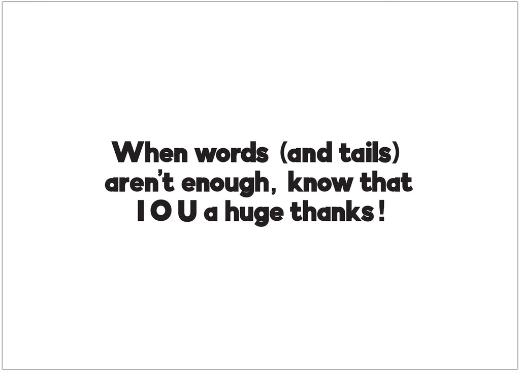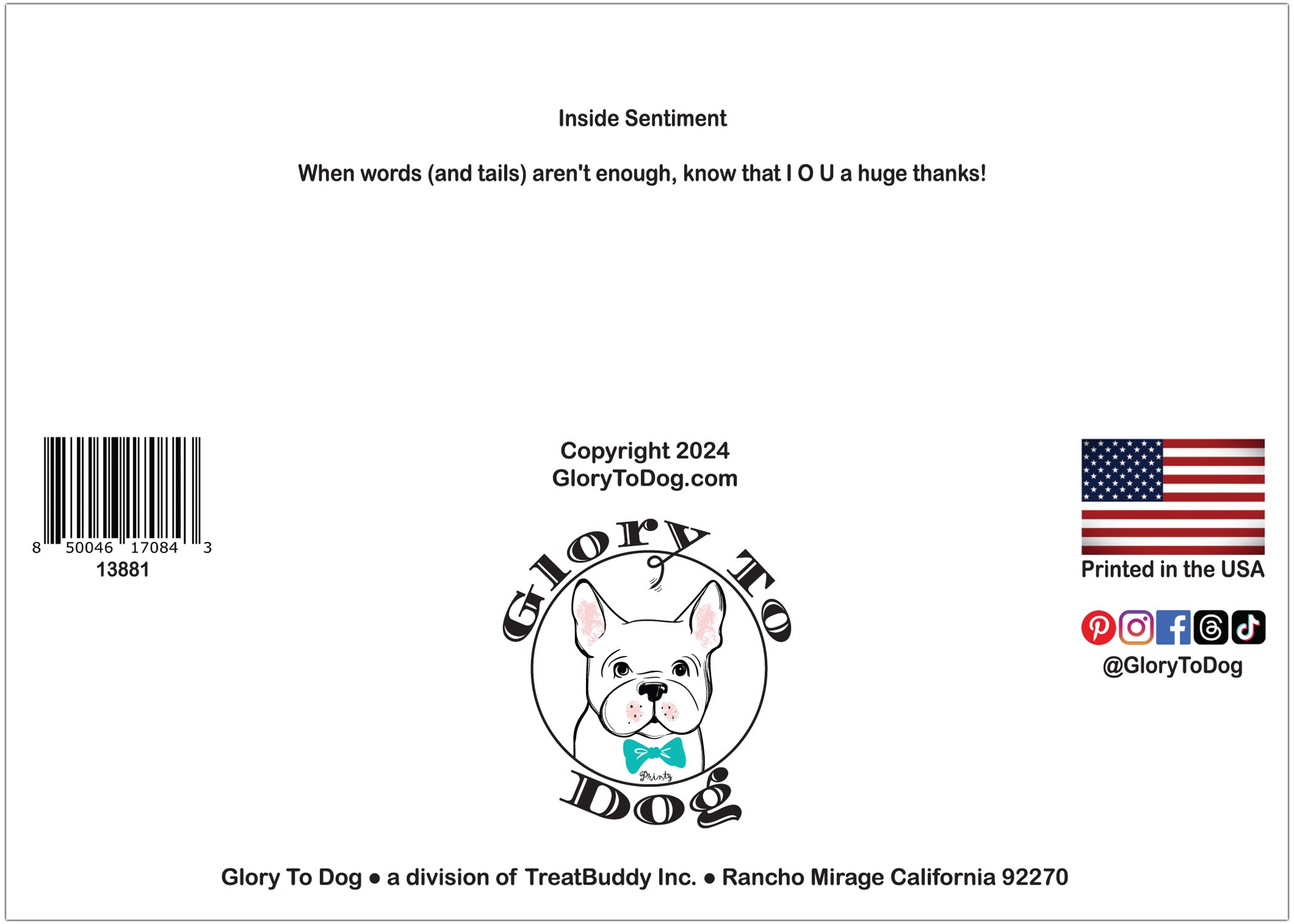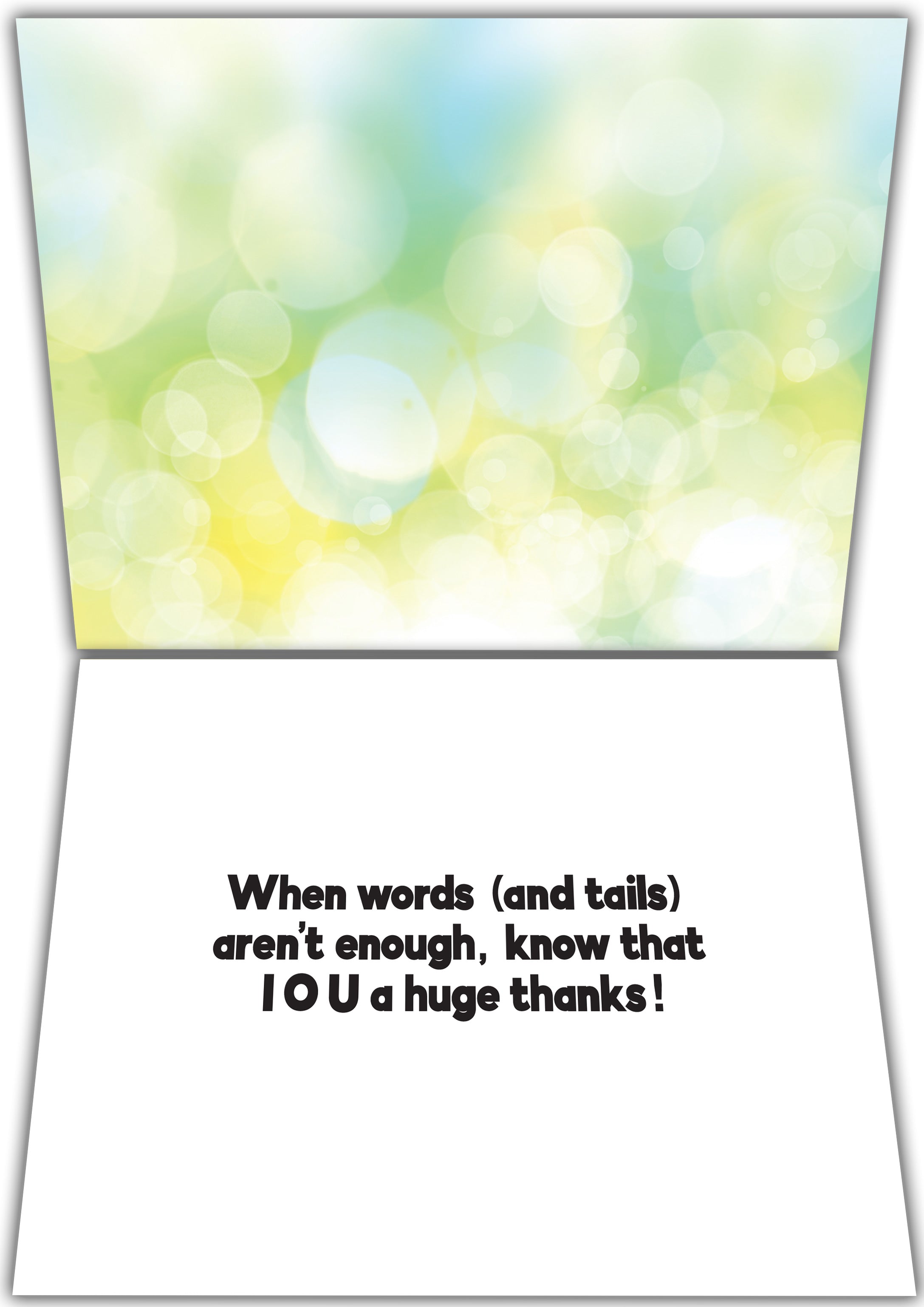 Open the card to reveal a bright and cheerful interior, featuring a soft focus bokeh background that exudes warmth and positivity. The inside message reads, "When words (and tails) aren't enough, know that I O U a huge thanks!" This clever and heartfelt sentiment perfectly complements the playful exterior, making it clear just how much you appreciate the recipient.