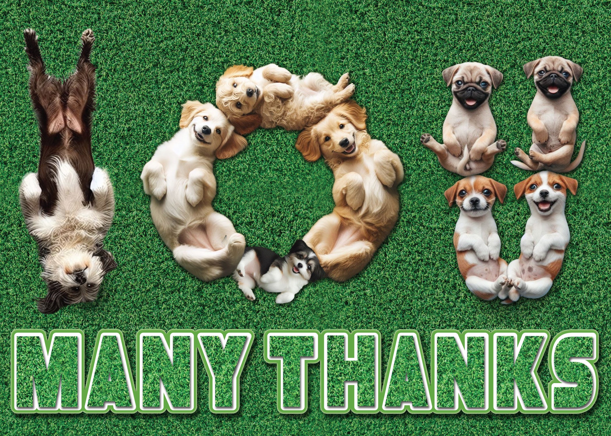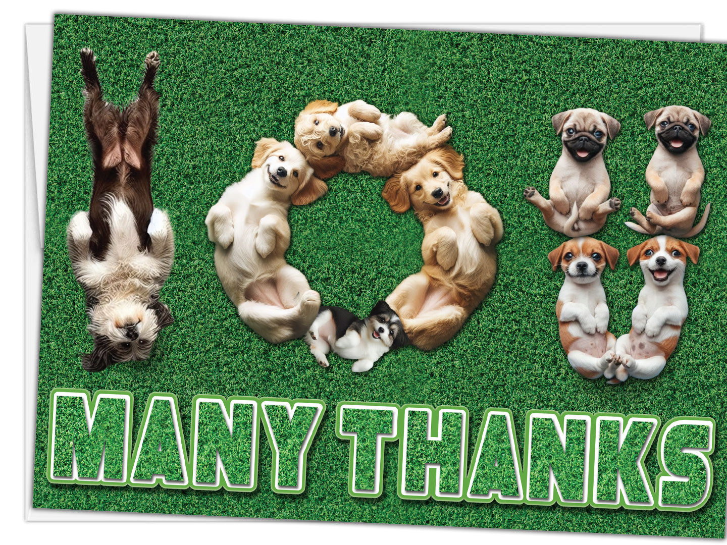 Brighten someone's day with our heartwarming "Puppy Thanks" greeting card, perfect for expressing your gratitude in a uniquely adorable way. This delightful card features a playful pack of pups sprawled out on a lush green lawn, creatively forming the letters I, O, and U with their lovable bodies. Each furry friend adds its charm to the design, from the black and white shepherd dog lying with legs splayed open as the "I" to the four dogs forming a perfect circle for the "O," and the two pugs and terriers cuddling together to shape the "U." The phrase "Many Thanks" is eye-catchingly displayed in grassy lettering. The vibrant colors and joyful expressions of the pups are sure to bring a smile to anyone's face and convey your heartfelt appreciation in the most delightful way.