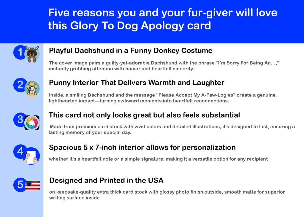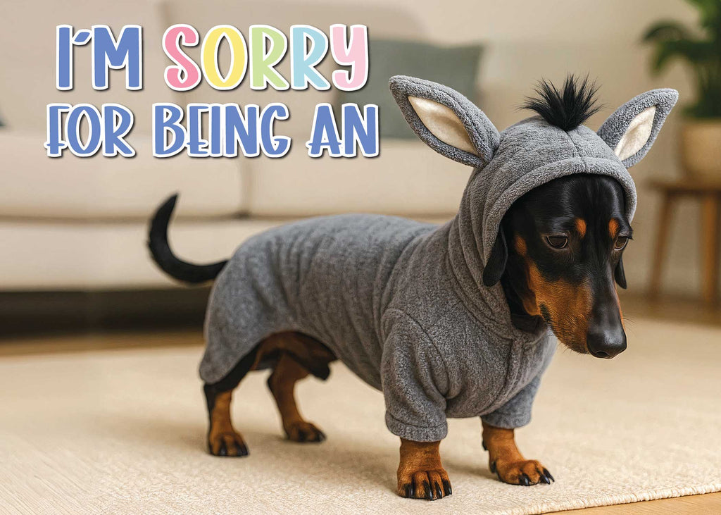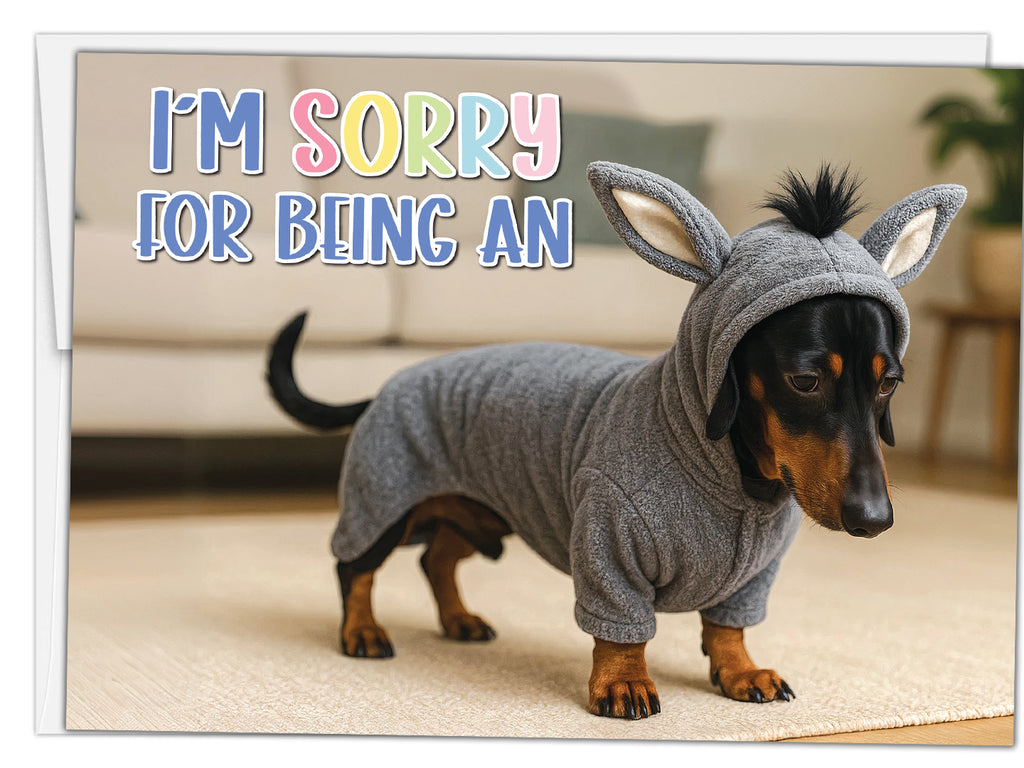 The front cover sets the playful tone with a black-and-tan Dachshund dressed in an oversized donkey costume, ears drooping as if caught in a guilty moment. Above the image, the phrase “I’m Sorry For Being An…” adds cheeky humor while still conveying true regret. The combination of silly costume and bashful expression creates a lighthearted but genuine vibe—perfect for breaking the ice after a mistake.