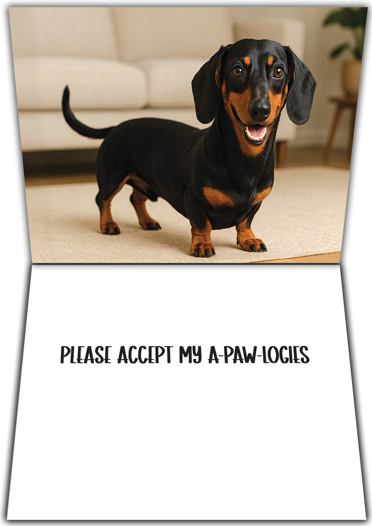 Inside, the card keeps the charm going with a smiling Dachshund looking hopefully at the recipient. The clever pun “Please Accept My A-Paw-Logies” completes the message in a warm, sincere way. This balance of adorable imagery and heartfelt humor makes the card ideal for partners, friends, or anyone you’ve wronged. It’s more than just an apology—it’s a reminder that laughter and affection can turn awkward moments into opportunities for reconnection.