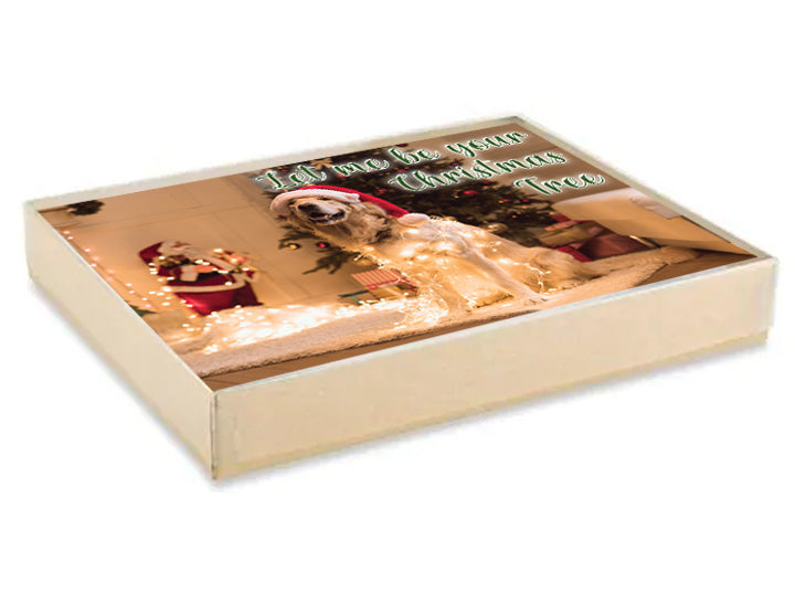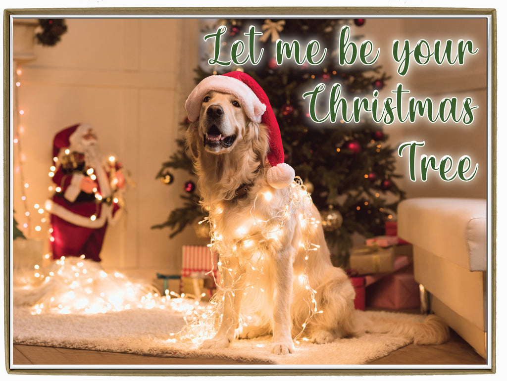 Get ready to add a touch of canine cheer to your holiday festivities with our "Let Me Be Your Christmas Tree" Christmas card! On the front, you'll be greeted by an irresistibly adorable Golden Retriever, sporting a big, mischievous smile and playfully wrapped in twinkling Christmas lights. The caption perfectly captures the festive spirit and humor: "Let Me Be Your Christmas Tree."