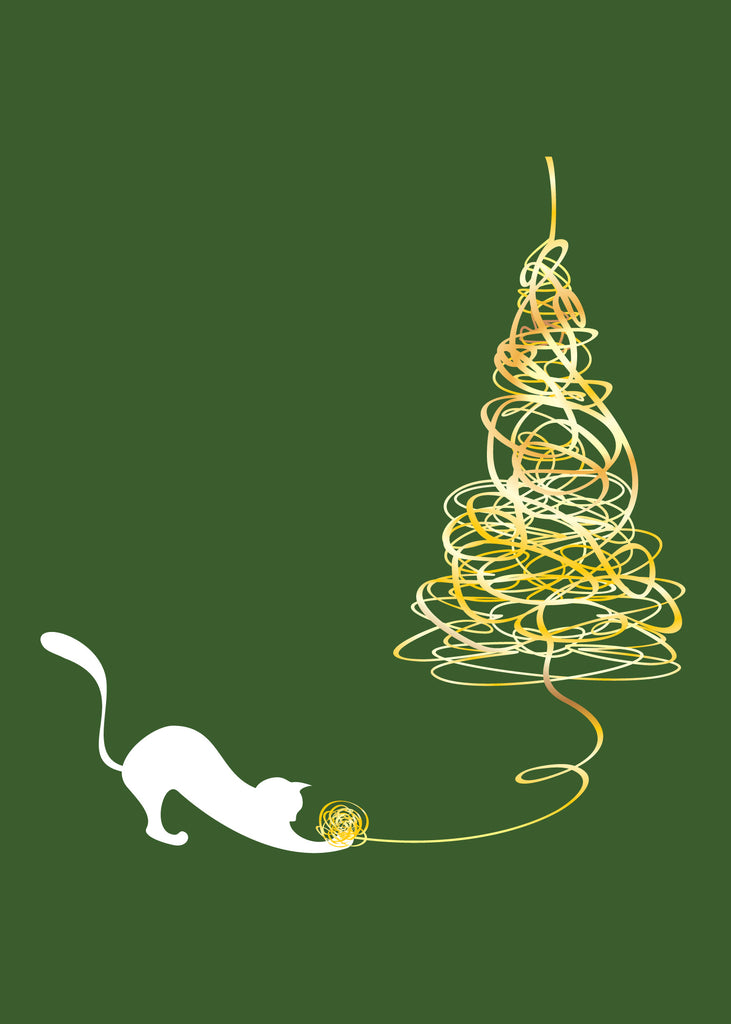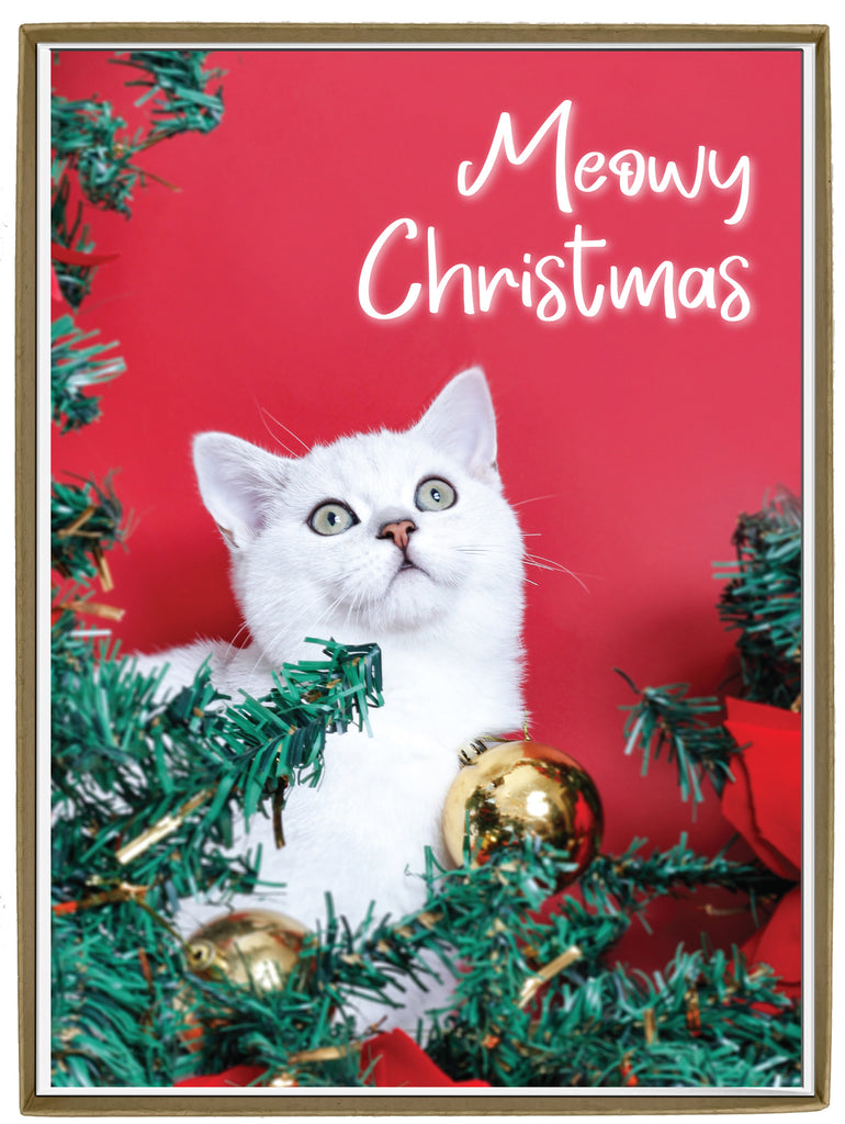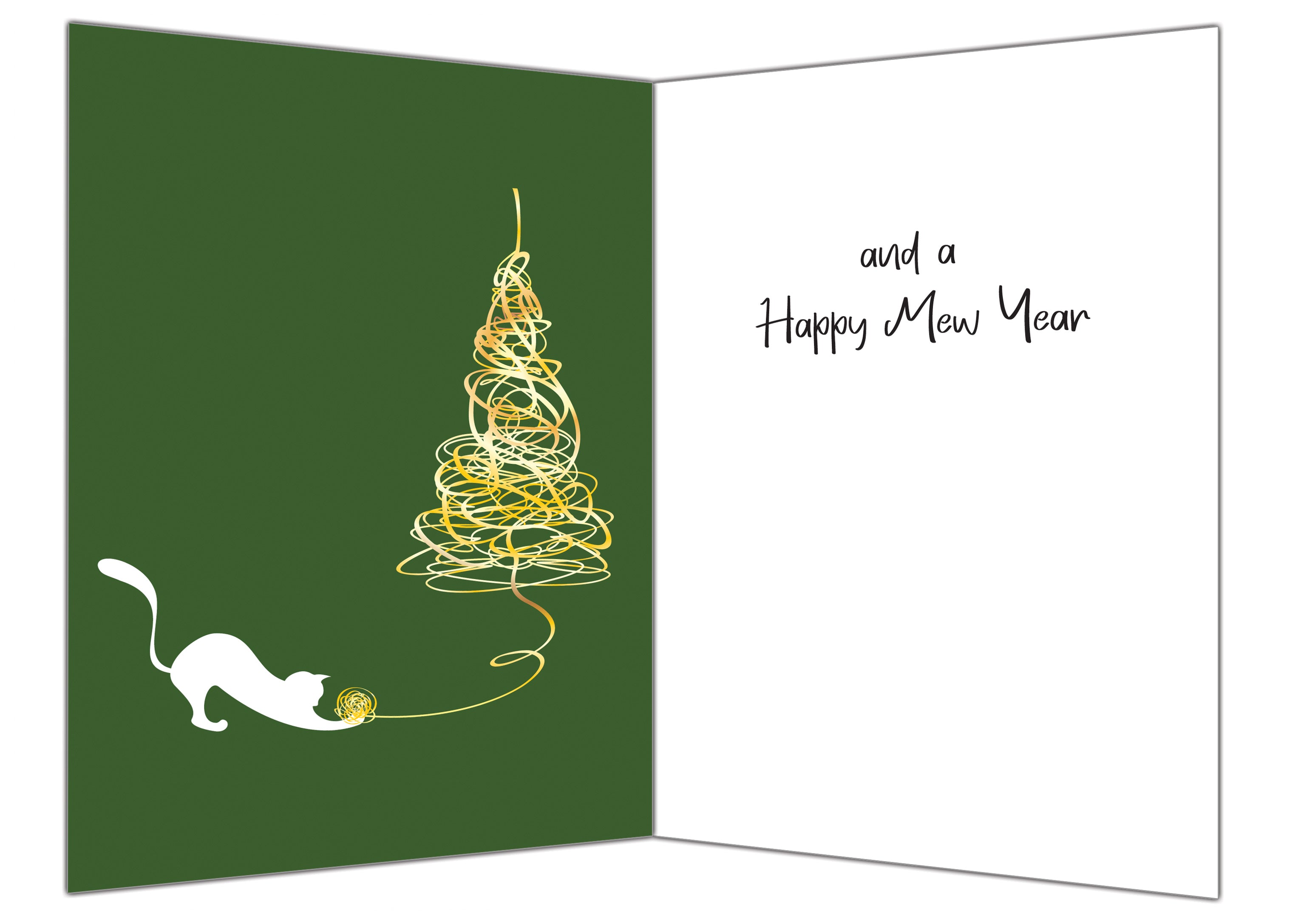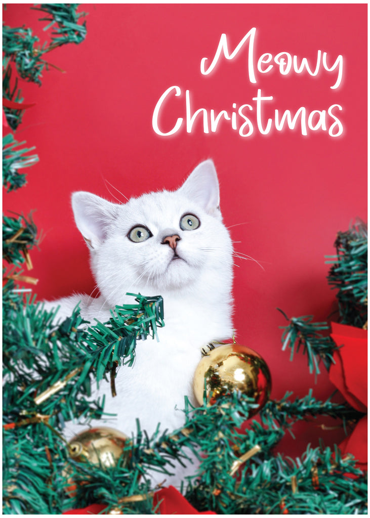 Anyone who knows cats knows they love to play under the Christmas tree, and this Meowy Christmas card captures that perfect way to spread holiday cheer to fellow feline enthusiasts! This heartwarming card features a stunning image of a pure white cat with mesmerizing pale green eyes, nestled amidst a beautifully adorned Christmas tree ona vibrant red background. The delicate details capture the festive spirit as the cat curiously explores the twinkling ornaments, creating a serene and delightful scene. Inside, a delightful surprise awaits: a charming drawing of a Christmas tree crafted from shimmering gold ribbon, with the silhouette of a playful cat dancing with the ribbon's end. It's a whimsical representation of the joy and merriment our feline friends bring to the holiday season. and a perect way to wish friends and famly a Happy 'Mew' Year. Share the magic of Catmas with friends and family as you send warm wishes and cat-loving vibes. Whether you're a proud cat parent or know someone who is, this Catmas Greetings Card is the purrfect choice to make this holiday season even more special. Let the cat-inspired festivities begin!