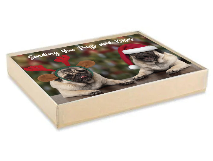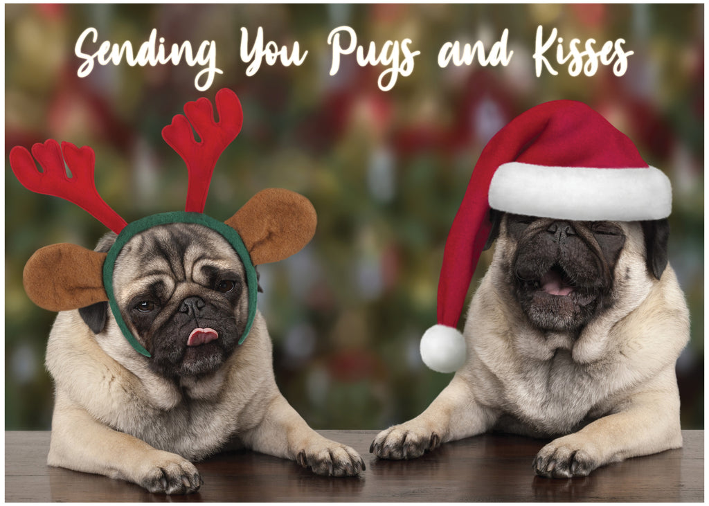 Celebrate the holiday season in adorable style with our charming Pug-themed Christmas card! On the front, you'll find two irresistibly cute Pugs, one sporting reindeer antlers and the other donning a Santa hat, both with that signature Pug charm and a hint of mischief in their expressions. The heartwarming main caption, "Sending you Pugs and kisses," sets the tone for a festive and love-filled holiday greeting.