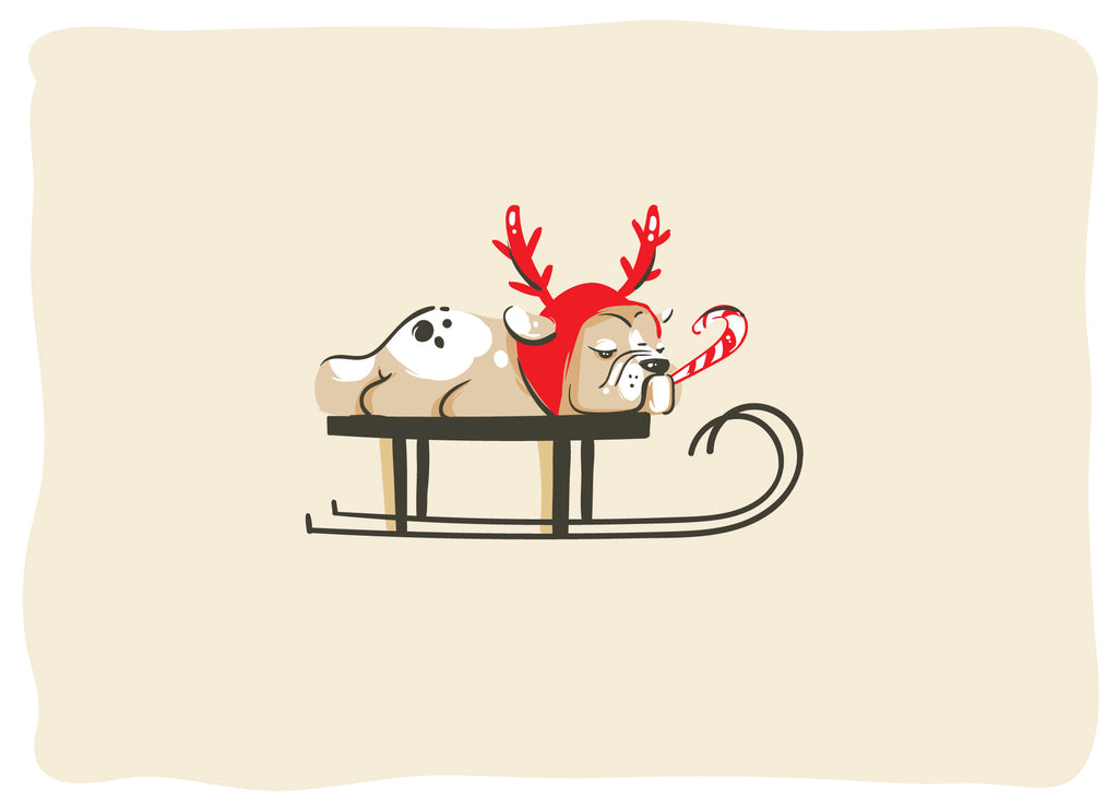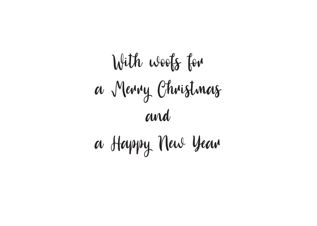 Inside, a charming hand-drawn illustration showcases a Pug riding a sled, decked out in reindeer antlers, capturing the whimsy of the season. The message, "with woofs for a Merry Christmas and a Happy New Year," adds a playful touch that celebrates the joy and warmth of the holidays.