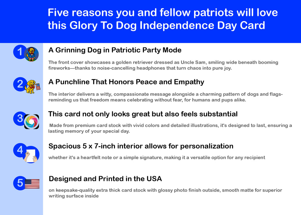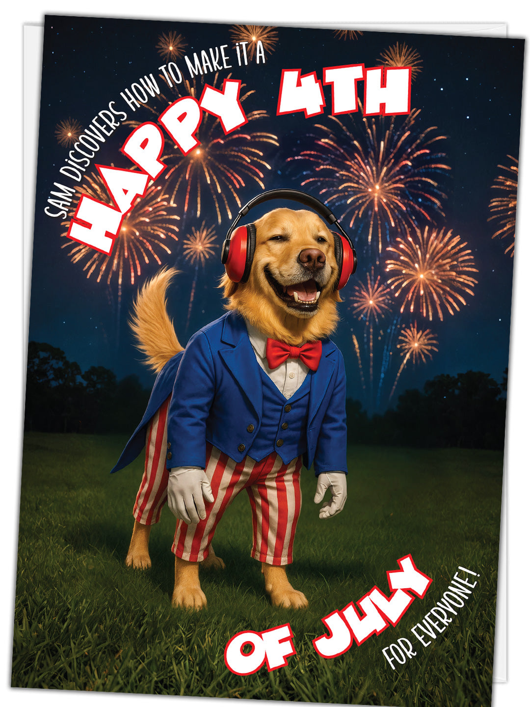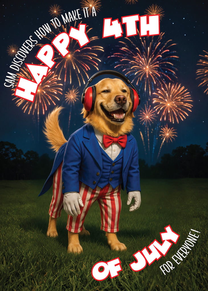 The front cover of this 4th of July card brings humor and heart together in a big, bold way. A grinning golden retriever steals the show in full Uncle Sam attire—red bowtie, blue jacket, and patriotic pants—while fireworks burst behind him. But it’s his oversized red noise-cancelling headphones that make this image iconic. The caption, “Sam discovers how to make it a Happy 4th… for everyone,” sets the tone for a celebration that includes even the most sensitive among us.