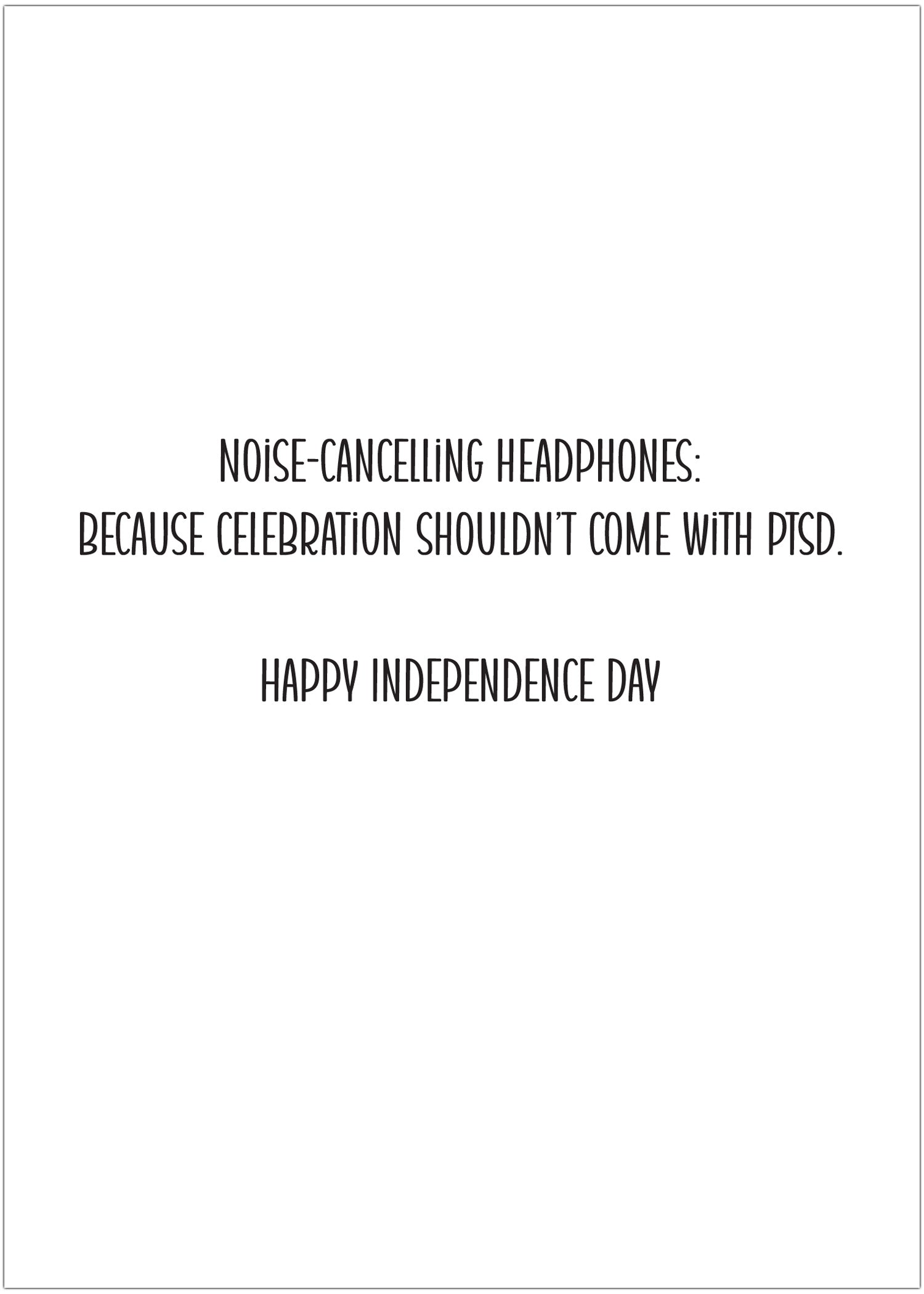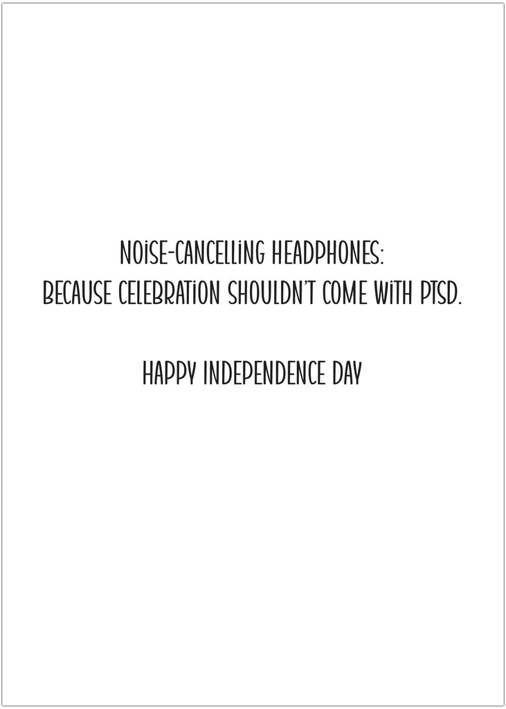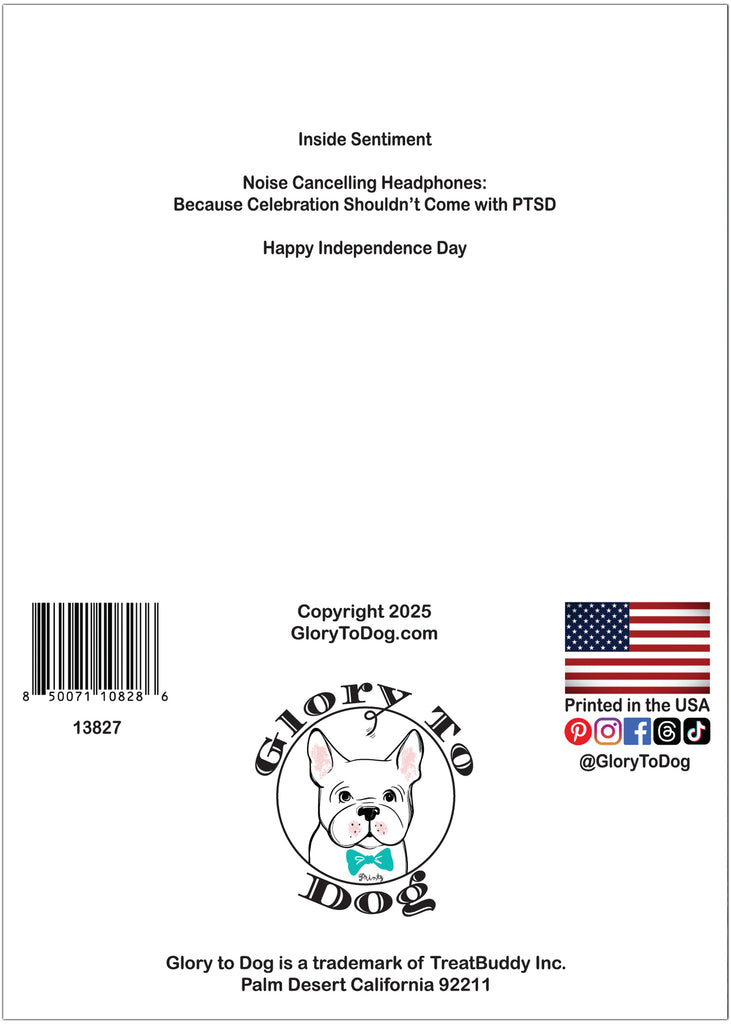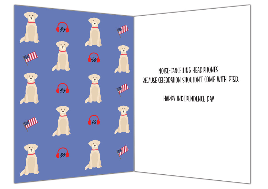 Inside, the punchline hits with wit and empathy: “Noise-cancelling headphones: because celebration shouldn’t come with PTSD. Happy Independence Day.” The interior design features a repeat pattern of calm, smiling dogs, American flags, and headphone icons, reinforcing the theme of joy without overwhelm. It’s a clever, compassionate choice—perfect for dog lovers, veterans, or anyone who appreciates humor with a conscience.