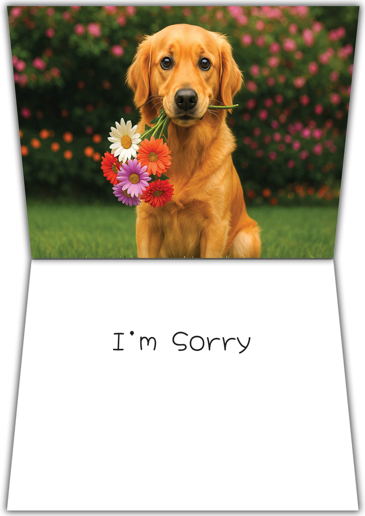 Inside, the dog appears again—this time holding a bouquet of colorful flowers, eyes wide with sincere hope for forgiveness. Beneath, the simple message “I’m Sorry” keeps the sentiment heartfelt and clear. This combination of humor and tenderness ensures the recipient feels both appreciated and understood. It’s a thoughtful, memorable way to apologize that turns awkward moments into opportunities for reconnection through laughter and love.