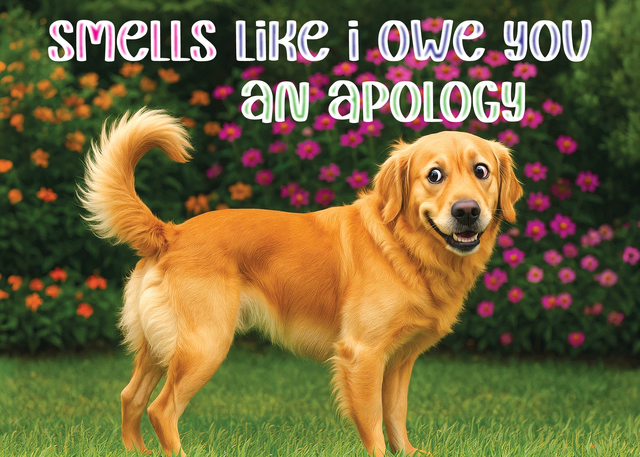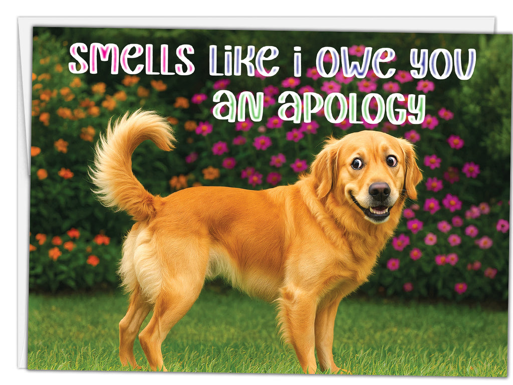 The cover of this playful apology card sets the tone with a Golden Retriever making the funniest guilty face, paired with the phrase “Smells like I owe you an apology.” It’s a lighthearted way to admit fart — oops, I mean fault — while breaking the tension. The silly expression of the pup captures the universal feeling of making a mistake, but softens it with humor, charm, and warmth.