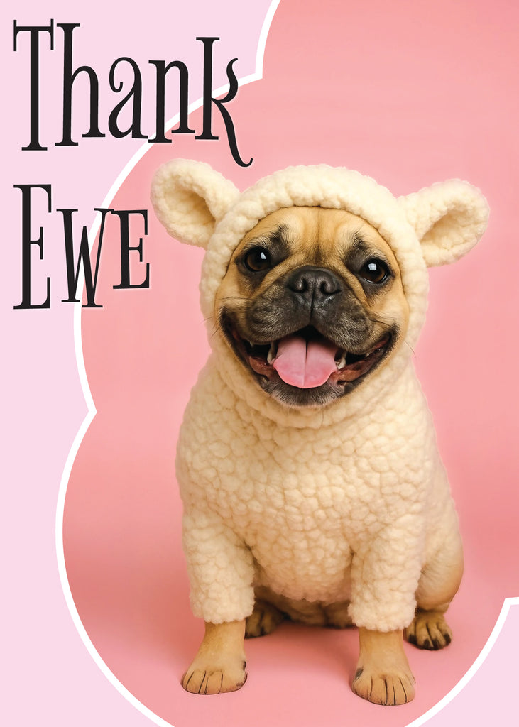 The front of this card instantly captures hearts with a smiling dog dressed as a sheep, set against a soft pink background with the playful phrase “Thank Ewe.” The silly yet adorable costume conveys joy, gratitude, and a lighthearted sense of fun, letting the recipient know they’re appreciated in the most unforgettable way. Perfect for dog lovers or anyone who enjoys a touch of humor with their heartfelt messages.