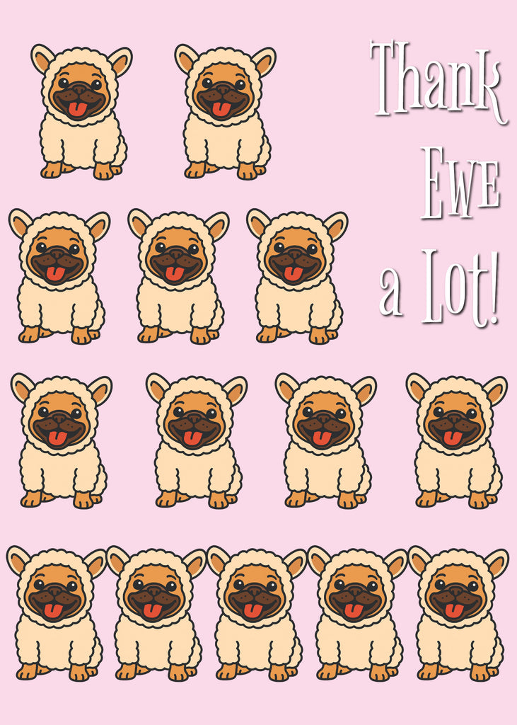 Inside, the cheer continues with rows of cartoon pugs in sheep outfits and the words “Thank Ewe a Lot!” creating a chorus of adorable thanks. The design fills the card with warmth and laughter, making your gratitude feel big and genuine. This card is ideal for thanking friends, family, teachers, or colleagues in a way that’s both playful and sincerely heartfelt.