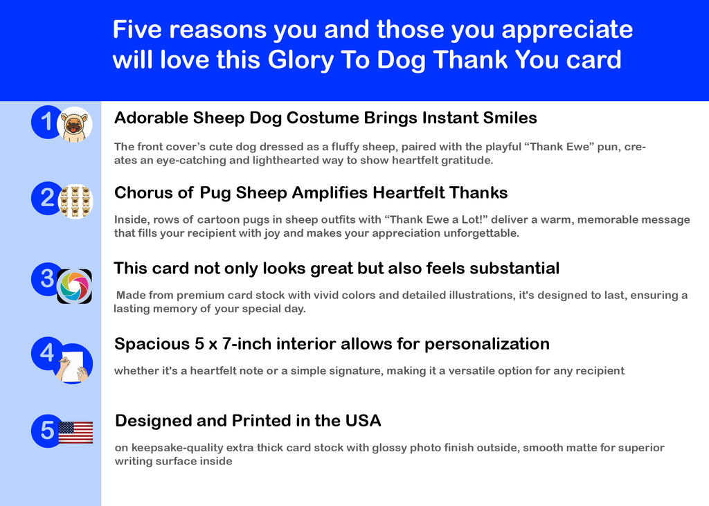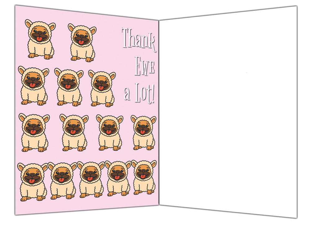 - Inside, the cheer continues with rows of cartoon pugs in sheep outfits and the words “Thank Ewe a Lot!” creating a chorus of adorable thanks. The design fills the card with warmth and laughter, making your gratitude feel big and genuine. This card is ideal for thanking friends, family, teachers, or colleagues in a way that’s both playful and sincerely heartfelt.