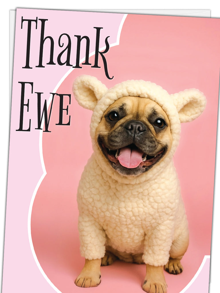 - The front of this card instantly captures hearts with a smiling dog dressed as a sheep, set against a soft pink background with the playful phrase “Thank Ewe.” The silly yet adorable costume conveys joy, gratitude, and a lighthearted sense of fun, letting the recipient know they’re appreciated in the most unforgettable way. Perfect for dog lovers or anyone who enjoys a touch of humor with their heartfelt messages.