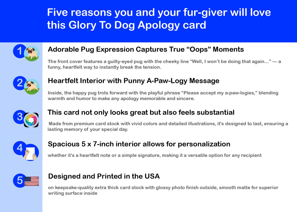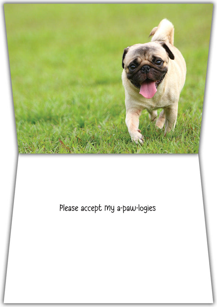 Inside, the mood brightens as the same pug happily trots across the grass, full of energy and ready to make things right. The lighthearted pun “Please accept my a-paw-logies” drives home the message with warmth and humor, reminding the recipient that even tough moments can be softened with a smile. Perfect for friends, family, or partners, this card makes an apology feel personal, heartfelt, and yes—paws-itively unforgettable.