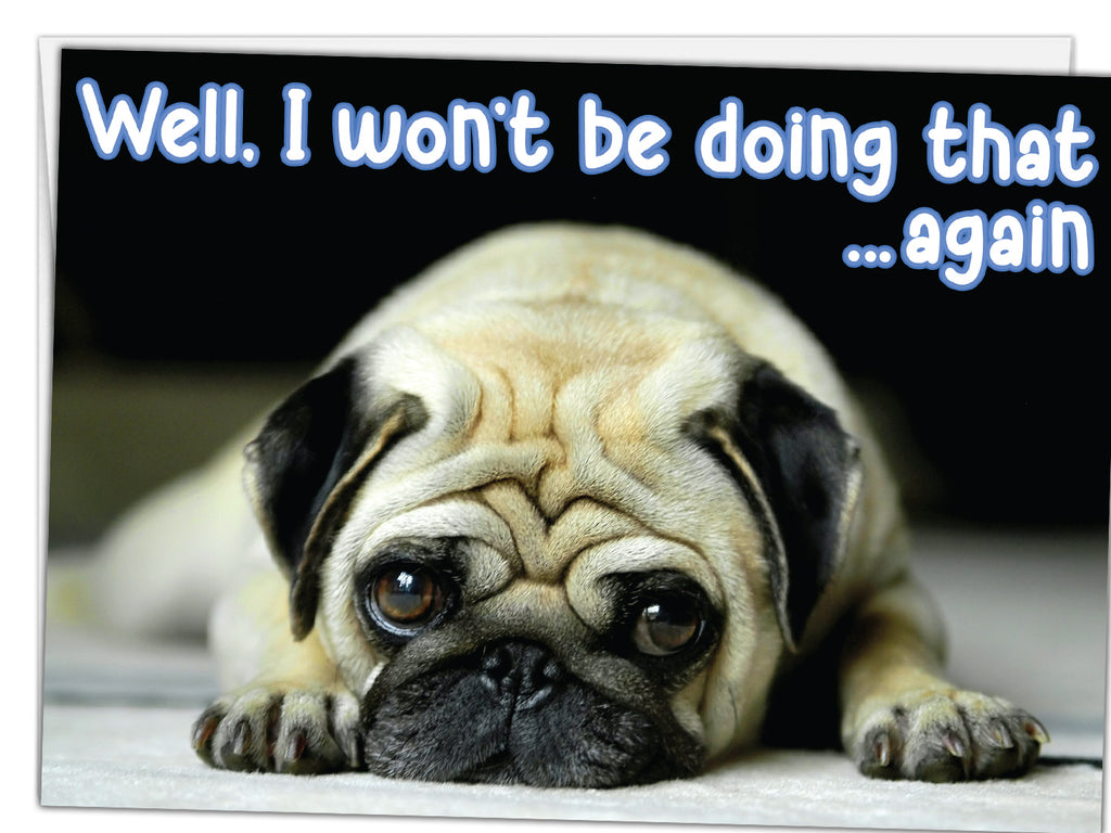 The front of this apology card captures the ultimate “whoops” moment, with a pug lying flat and staring up with big, guilty eyes that say everything words can’t. Paired with the line “Well, I won’t be doing that again…,” the cover sets a playful but sincere tone. It’s instantly relatable—whether you’re apologizing for a small mistake or a bigger blunder, this pug’s expression makes it clear you’re truly sorry (but still able to laugh about it).