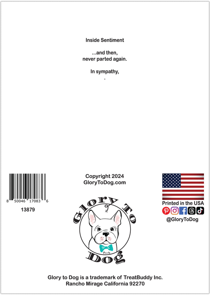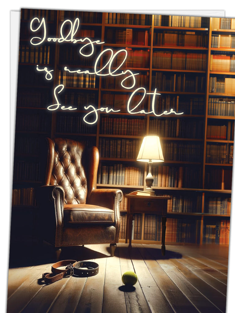 Express your heartfelt condolences with our "Goodbye Is Really See You Later" sympathy card, thoughtfully designed to honor the memory of a beloved dog. Featuring a warm, homey scene of an empty wingback armchair in a softly lit library, this bereavement card captures the profound sense of loss and emptiness that pet parents feel. The rolled-up collar, lead, and well-used tennis ball evoke cherished memories and symbolize the eternal bond between a pet and its owner. The inside message, "...And Then, Never Parted Again," offers comfort and hope, suggesting a reunion in the afterlife. This beautiful, evocative card is perfect for expressing sympathy and providing solace during a difficult time. Ideal for pet loss, dog sympathy, and bereavement, this card is a touching gesture to show your empathy and support.