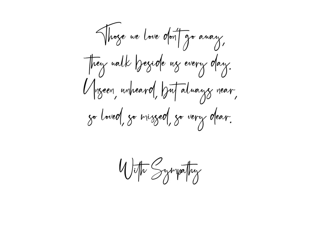 Message: [foot/paw prints in sand] / Those we love don't go away, they walk beside us every day. Unseen, unheard, but always near, so loved, so missed, so very dear. With Sympathy